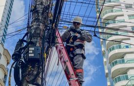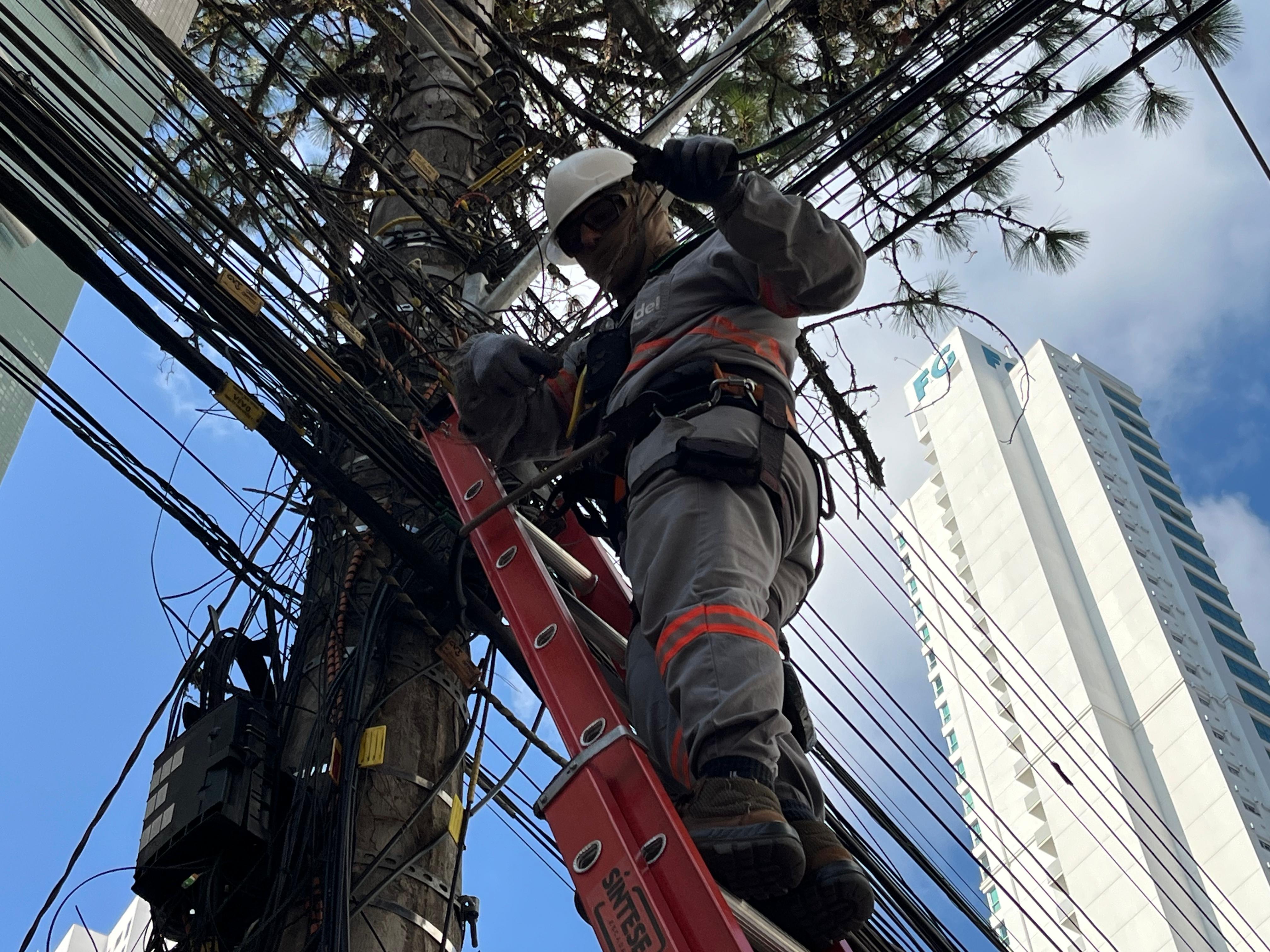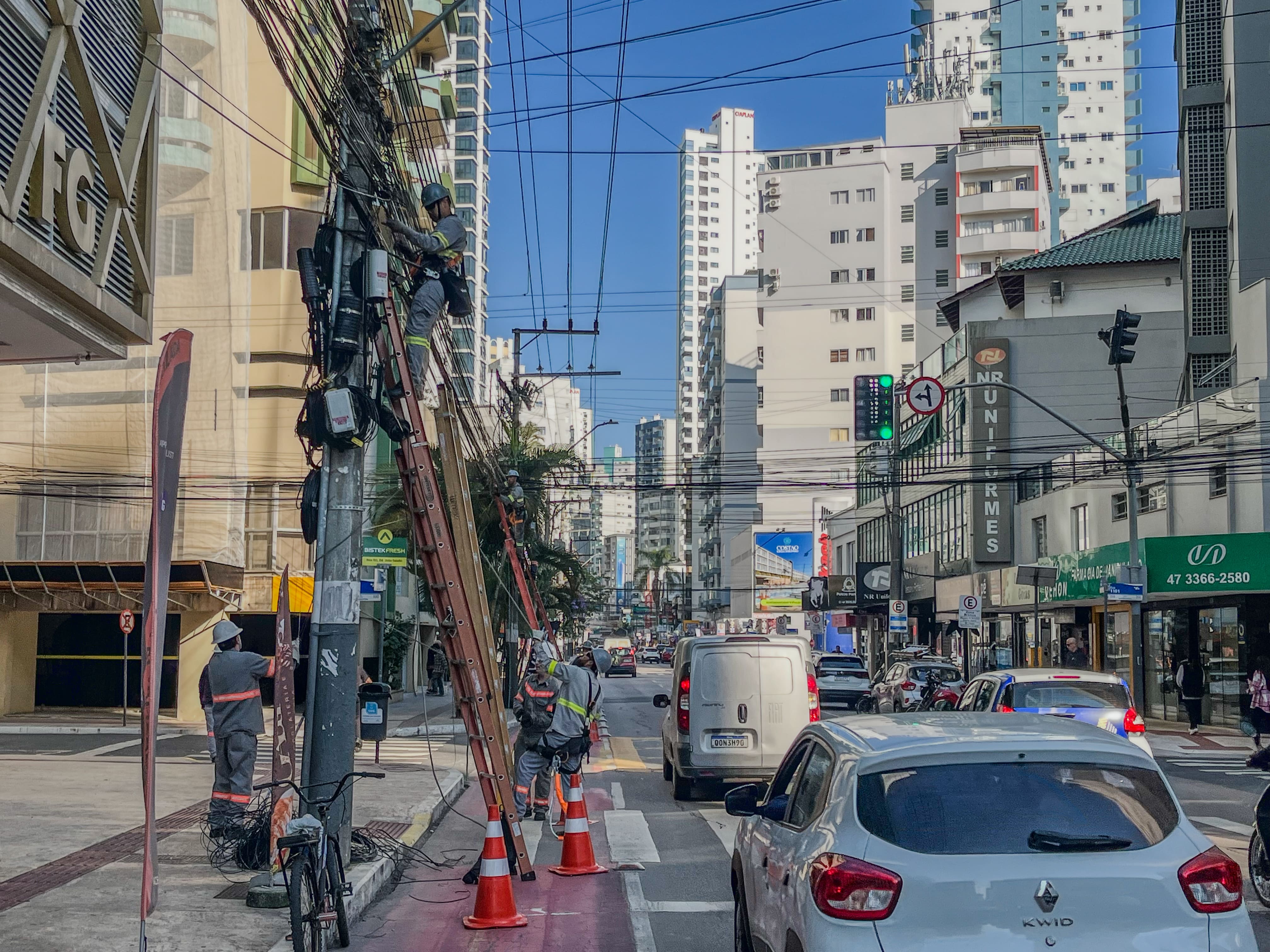 A Contribuição para o Custeio da Iluminação Pública (Cosip) de Balneário Camboriú realizou, nesta quarta-feira (9), mais uma força-tarefa de limpeza e organização da rede aérea de cabeamento. A operação aconteceu na Avenida Brasil, no trecho entre as ruas 1301 e 1061, no Centro, onde uma tonelada de fios soltos e obsoletos foi removida dos postes de iluminação pública.