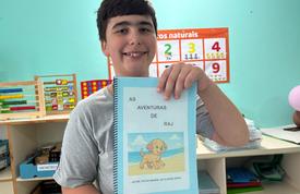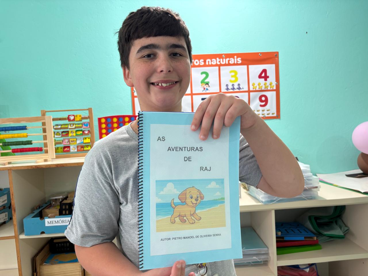 “No primeiro dia que eu vim a professora já deu a ideia de fazer um livro. Eu e a professora pensamos nas figuras e, como tenho dificuldades para escrever, ela me ajudou. Depois do primeiro, já pensei em fazer o segundo e lançar”, conta Pietro.