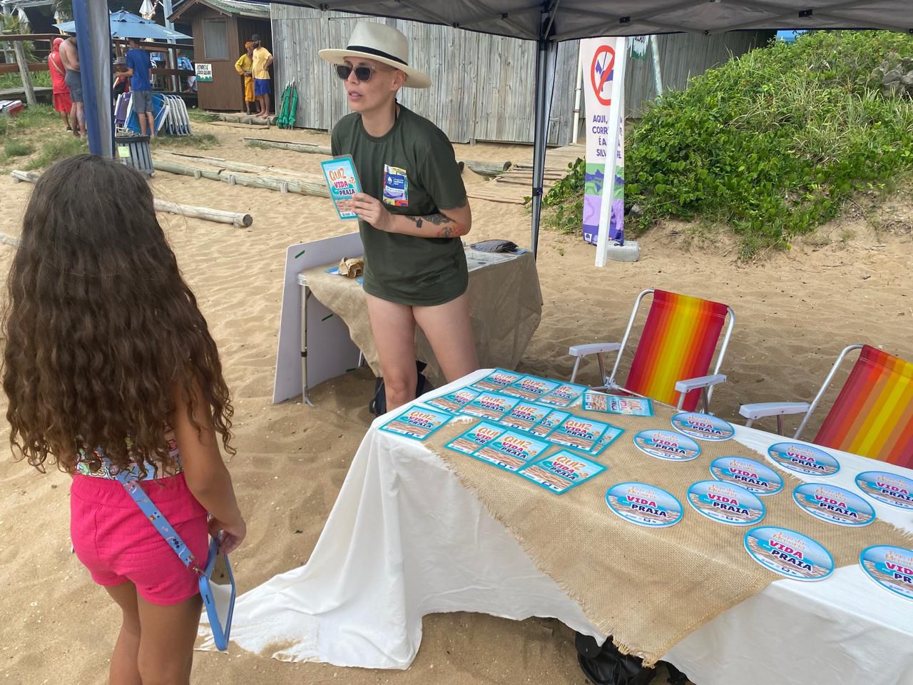 “A gente trouxe três jogos para as praias. Um deles é um quiz ambiental, uma brincadeira de perguntas e respostas para ver se o conteúdo que a gente passou foi assimilado pelas pessoas. Temos um joguinho de memória, em que trabalhamos com o público menor, de 4 a 7 anos, e também fizemos um quadro interativo para que pudéssemos brincar com o ímã da Bandeira Azul. Então é uma maneira interativa de passar essas orientações da forma mais lúdica e educativa possível”, disse.