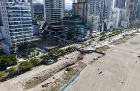 Em paralelo, na área interna da orla as equipes seguem com as obras estruturantes, entre elas, a construção do muro de proteção costeira no trecho 4 - estrutura que atua como contenção e barreira contra a erosão, protegendo a faixa de areia e o passeio público. No trecho 1, também estão em construção as vigas da pista de corrida e dos canteiros que receberão as árvores. Ao todo, a etapa Barra Sul da reurbanização contempla cinco trechos: três localizados antes do trecho piloto e dois após.