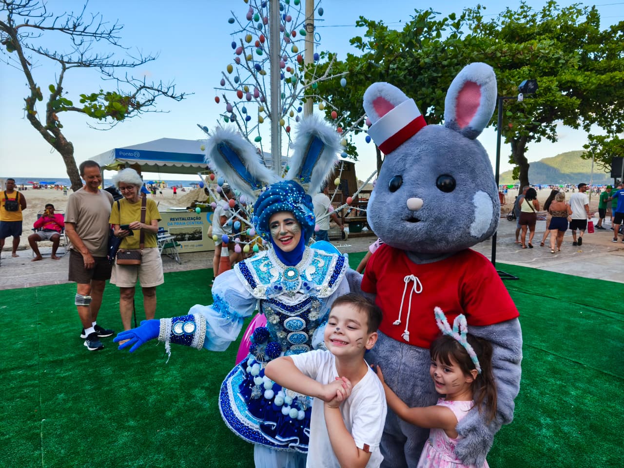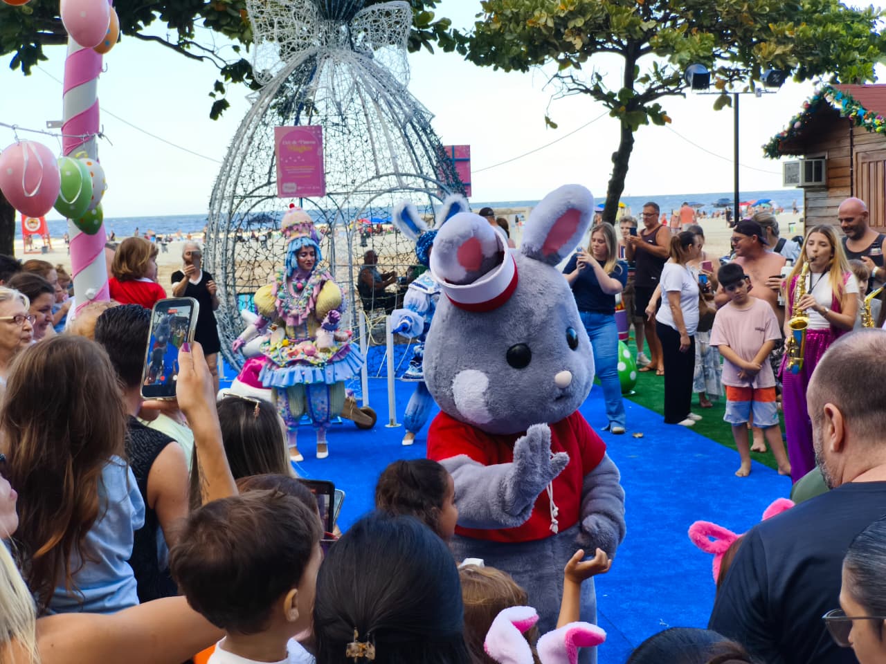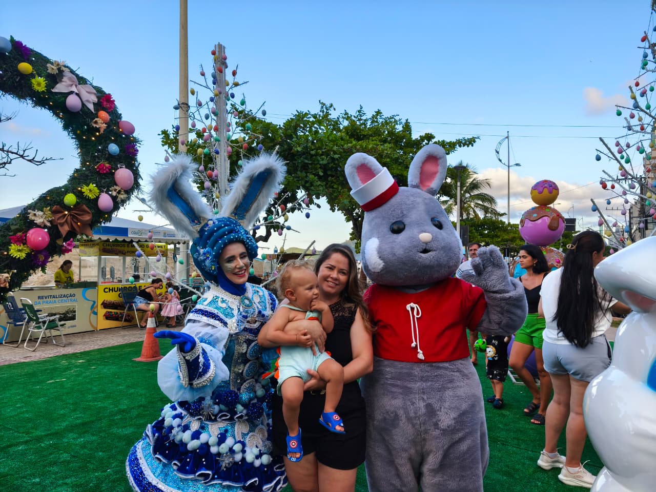 Diversos personagens temáticos garantiram momentos de alegria para pessoas de todas as idades. A programação também contou com a apresentação de uma banda formada por cinco integrantes, animando o público e quem passava pela orla da Praia Central. A presença especial do Coelho de Páscoa, que tirou fotos e interagiu com as crianças, marcou o ponto alto do evento.