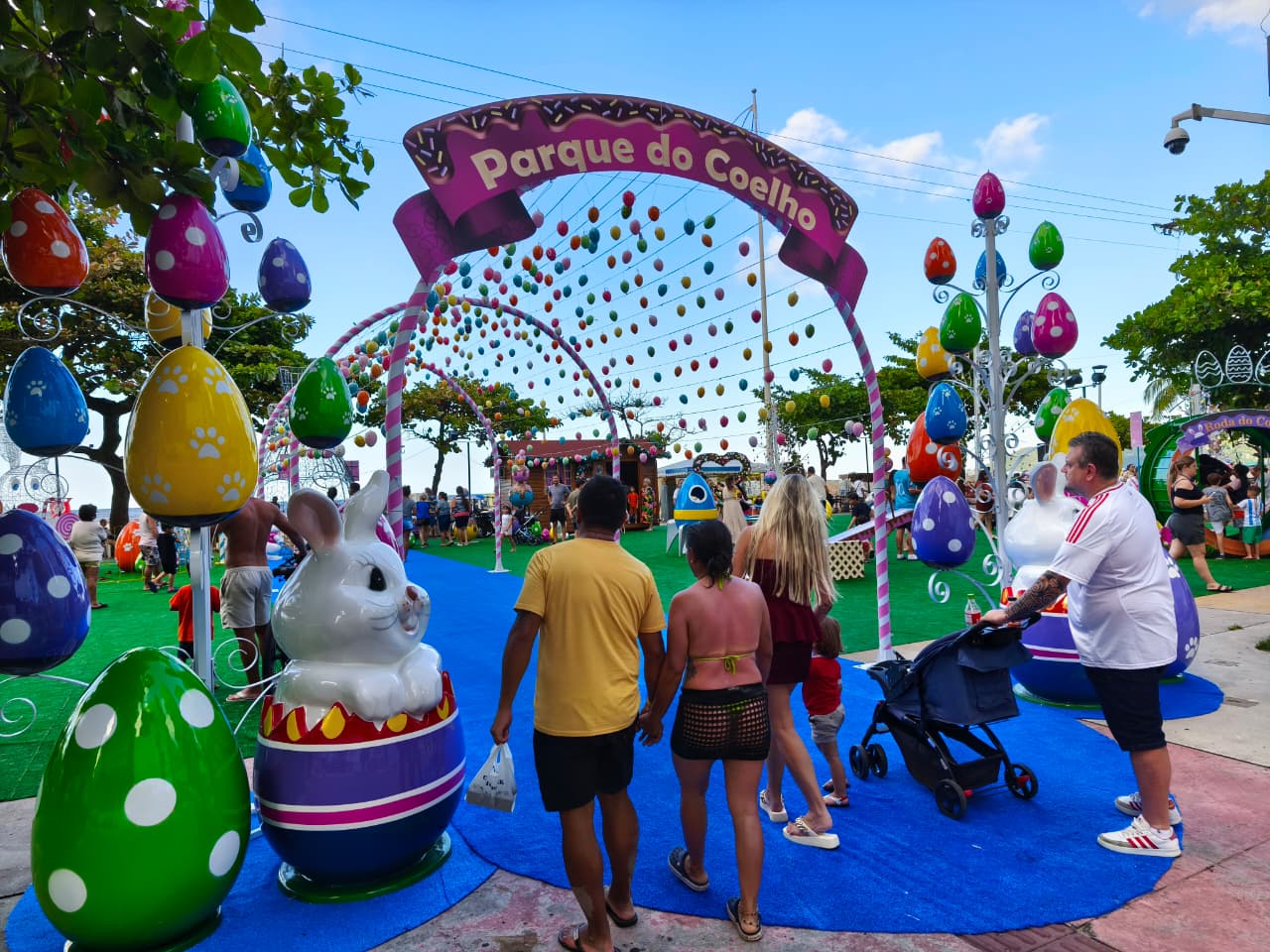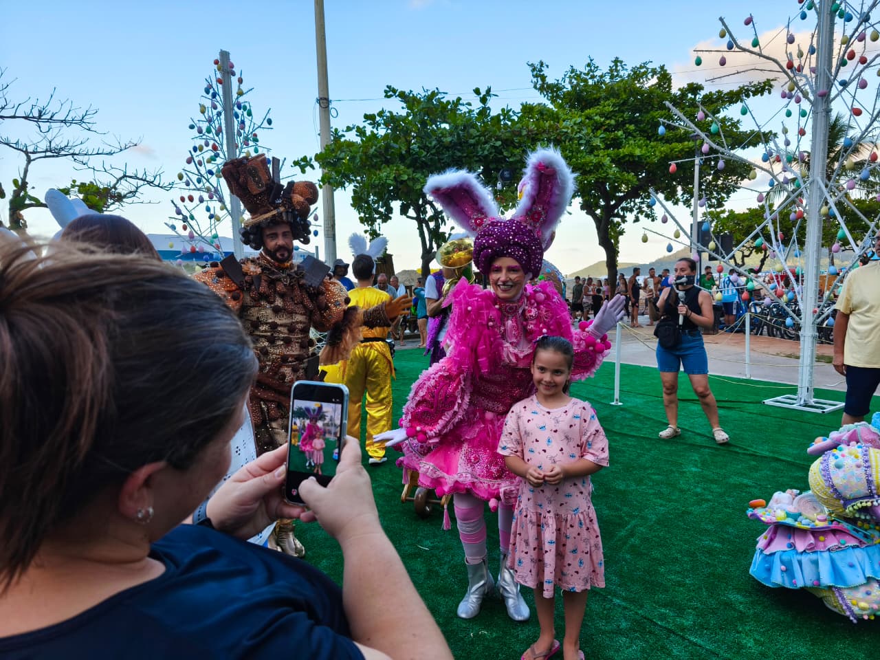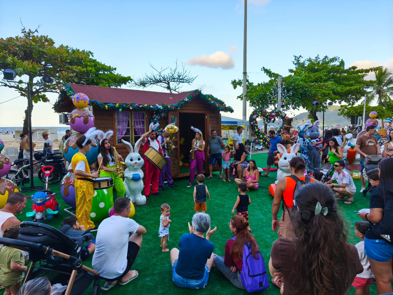 Diversos personagens temáticos garantiram momentos de alegria para pessoas de todas as idades. A programação também contou com a apresentação de uma banda formada por cinco integrantes, animando o público e quem passava pela orla da Praia Central. A presença especial do Coelho de Páscoa, que tirou fotos e interagiu com as crianças, marcou o ponto alto do evento.