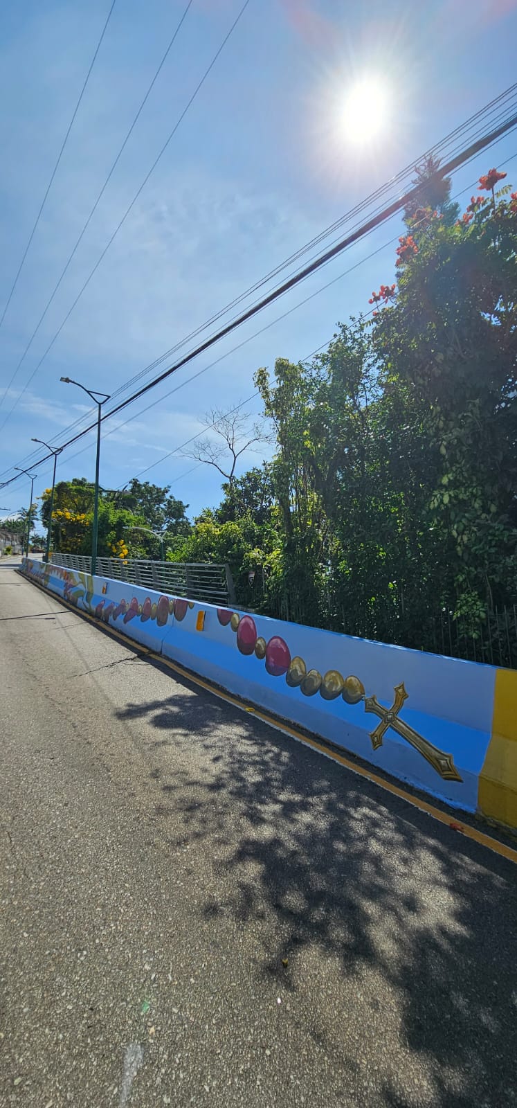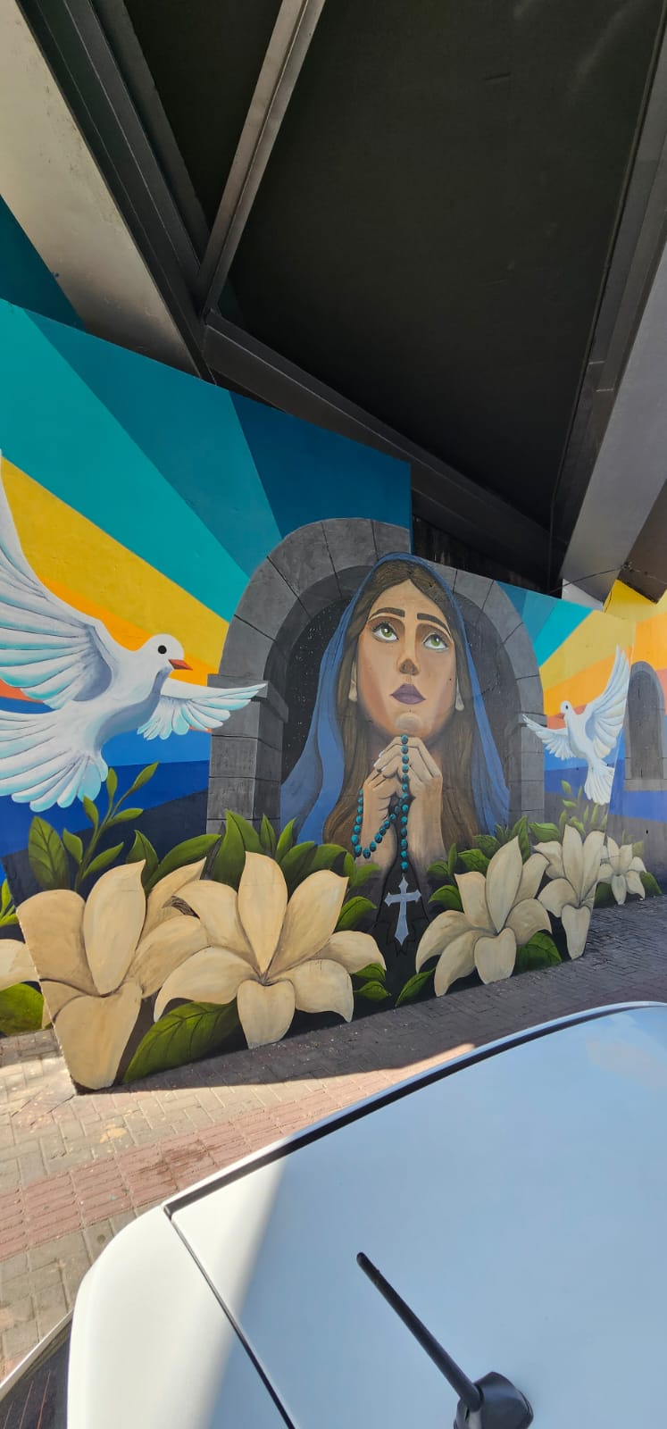 Uma narrativa dedicada ao início da vida de Jesus é retratada na terceira parede. As demais paredes fazem referência a um grande rosário. “A intenção é criar a sensação de que esse rosário esteja flutuando no céu, acompanhando o observador em distintos pontos de vista e ampliando a dimensão contemplativa da obra. Esse recurso fortalece o caráter simbólico do mural e contribui para integrar arte, arquitetura e paisagem urbana em uma única leitura visual”, comenta.