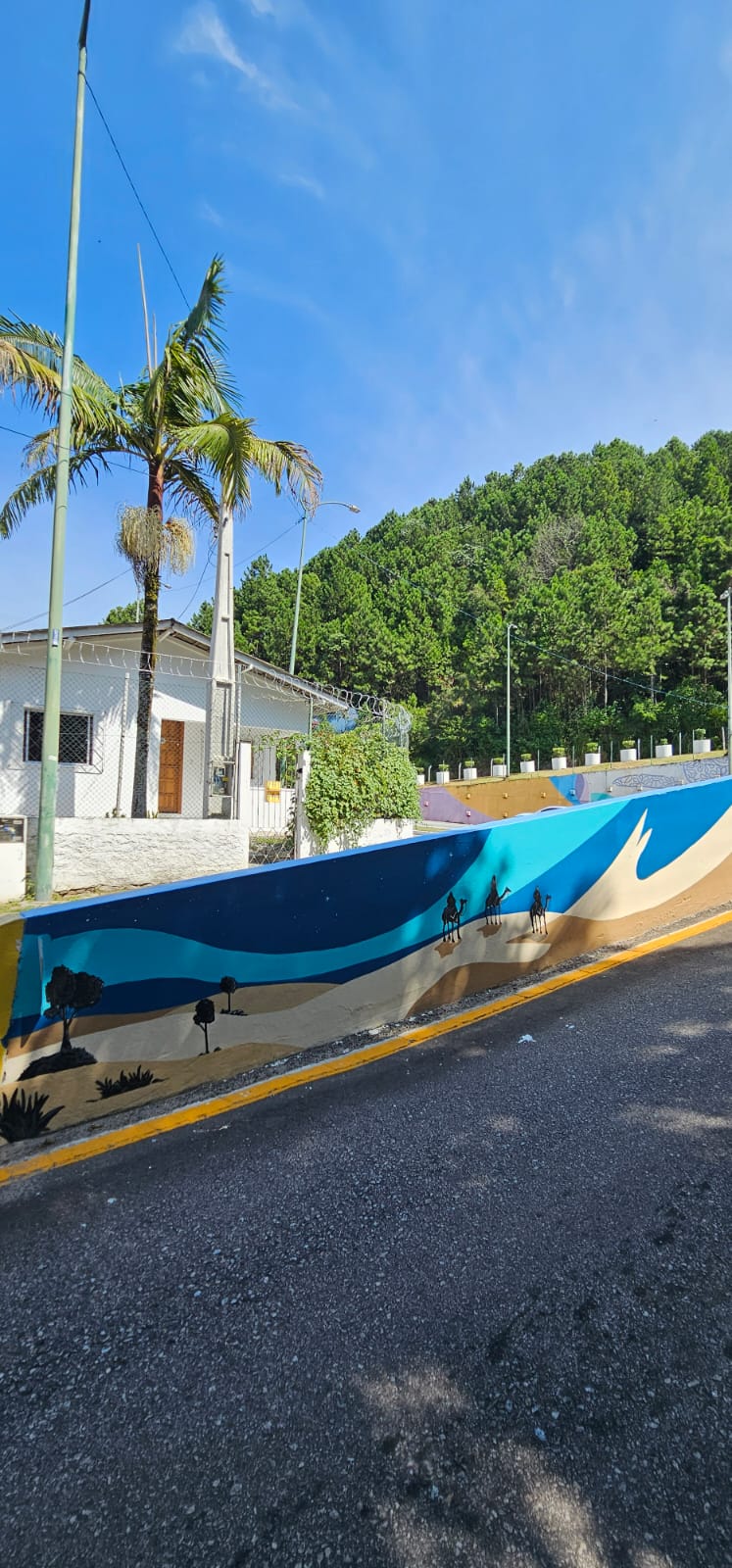 A primeira parede tem a imagem de Virgem Maria olhando para o alto e segurando um terço, com as mãos em oração. Na segunda, está Jesus Cristo, cuja representação foi inspirada na escultura do Cristo Luz. “A imagem de Cristo surge como presença que ilumina, abençoa e protege a cidade. Abaixo dessa representação, desenvolve-se a paisagem de Balneário Camboriú, iniciando pelo Bairro da Barra, com destaque para a Capela de Santo Amaro, marco histórico e espiritual da cidade, e seguindo em transição até o skyline da orla (linha do horizonte), símbolo da BC contemporânea. A sequência se encerra em movimentos inspirados nas ondas do mar, costurando a composição com leveza e reforçando o vínculo entre fé, cidade e natureza”, explica o artista.