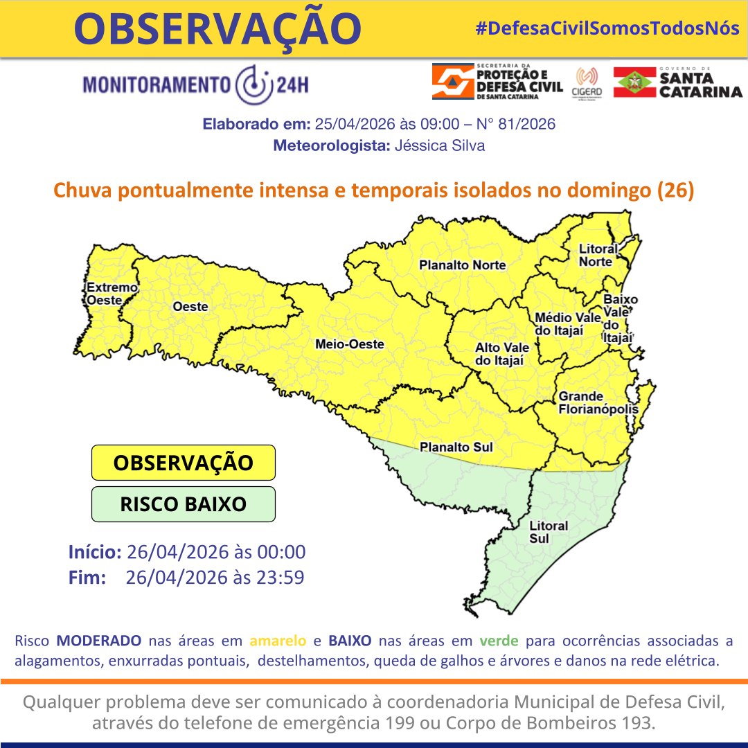 A Defesa Civil segue monitorando as condições climáticas e permanece em prontidão para atendimento de eventuais ocorrências. Em caso de emergência, a Defesa Civil pode ser acionada pelo telefone 199, pelo 153, da Central de Operações, ou pelo telefone de plantão (47) 9 9232-4928.