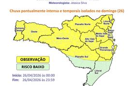 A Prefeitura de Balneário Camboriú, por meio da Defesa Civil, alerta para possibilidade de chuva pontualmente intensa e temporais isolados a partir da madrugada deste domingo (26). O município está na área amarela, considerada em observação para ocorrências associadas a alagamentos, enxurradas pontuais, queda de galhos e árvores, destelhamentos e danos na rede elétrica.