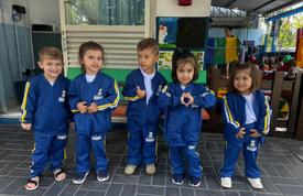 Cada criança receberá uma jaqueta escolar confeccionada em malha helanca colegial careca com bolsos canguru e gola tipo padre; uma calça (masculina em malha helanca colegial careca e feminina em suplex careca); e duas camisetas de manga longa com gola redonda, confeccionadas em meia malha PA.