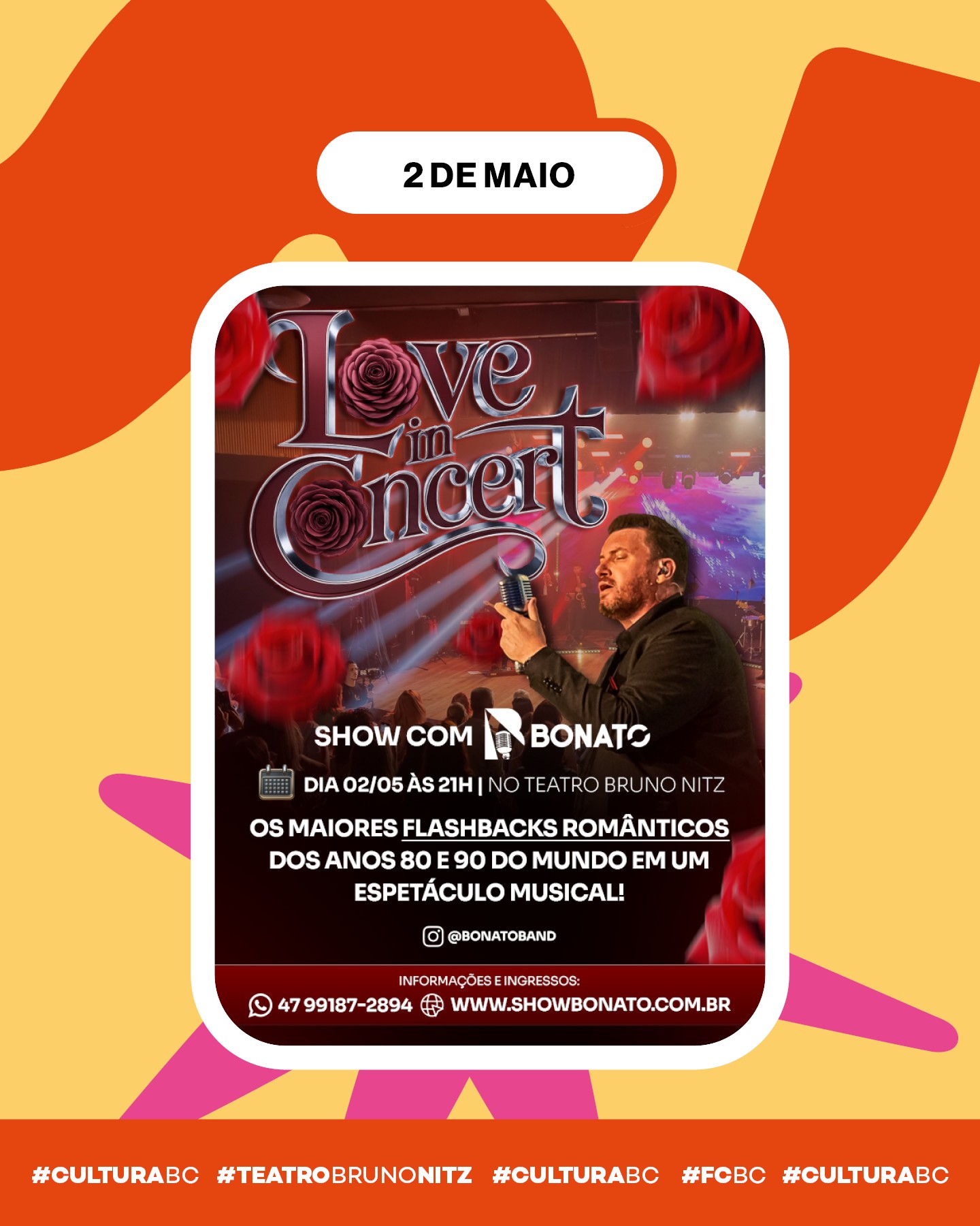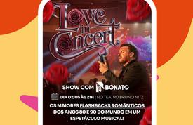 O espetáculo “Love in Concert” abre a agenda de maio do Teatro Municipal Bruno Nitz, em Balneário Camboriú, neste sábado (2). Com um repertório formado por sucessos do pop e rock dos anos 1980 e 1990, o show começa às 21h e será comandado pelo cantor Bonato e sua banda. Os ingressos estão à venda pelo site https://www.sympla.com.br .