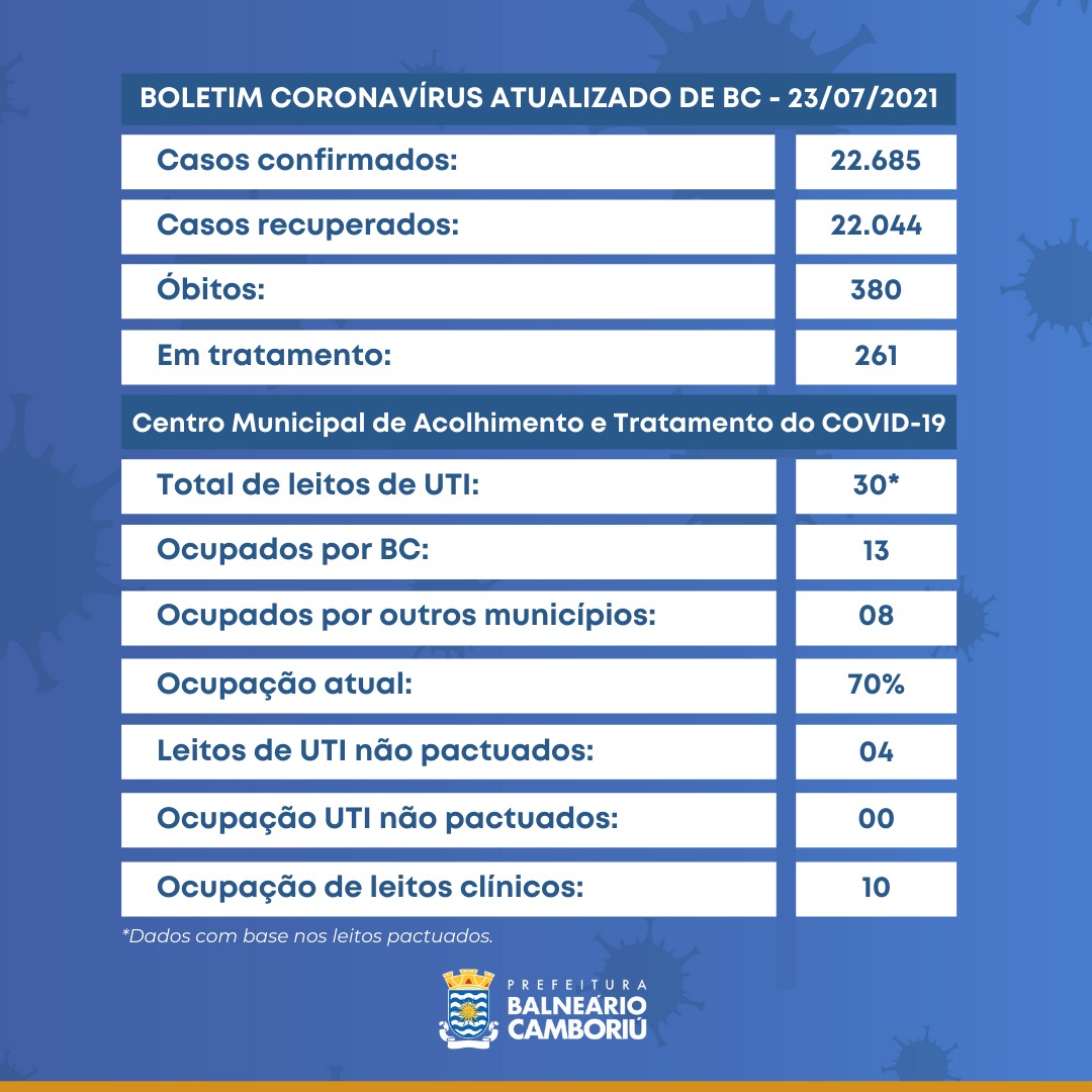 Nesta sexta-feira (23), Balneário Camboriú registrou 40 novos casos confirmados de Coronavírus. O município chega a 22.685 casos, sendo que 22.044 destes (97,1%) já estão recuperados e receberam alta da Vigilância Epidemiológica Municipal. Permanecem em tratamento 261 pacientes, sendo 230 tratamentos em domicílio e 31 internados.