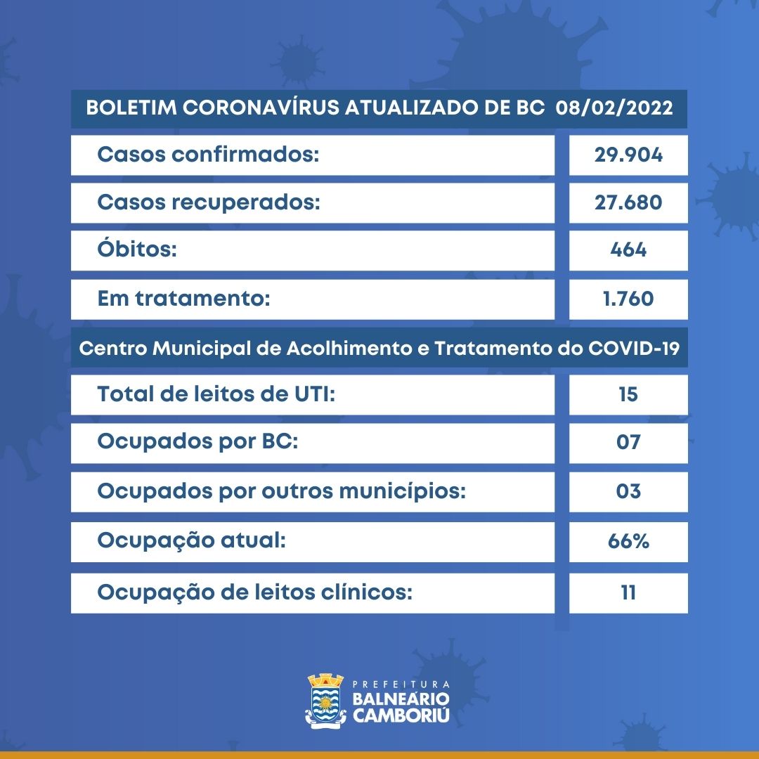 Nesta terça-feira (08), Balneário Camboriú registra dez pacientes internados na UTI do Centro Municipal de Acolhimento e Tratamento de Coronavírus, sendo sete de Balneário Camboriú, um de Itapema, um de Porto Belo e um de Bombinhas, equivalente a taxa de ocupação de 66%.