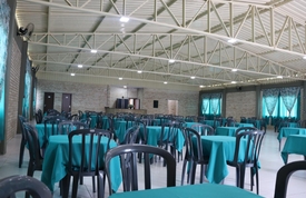 O espaço possui uma ampla sala com mesas e cadeiras, banheiros feminino e masculino, cozinha equipada com geladeira e área com churrasqueira.