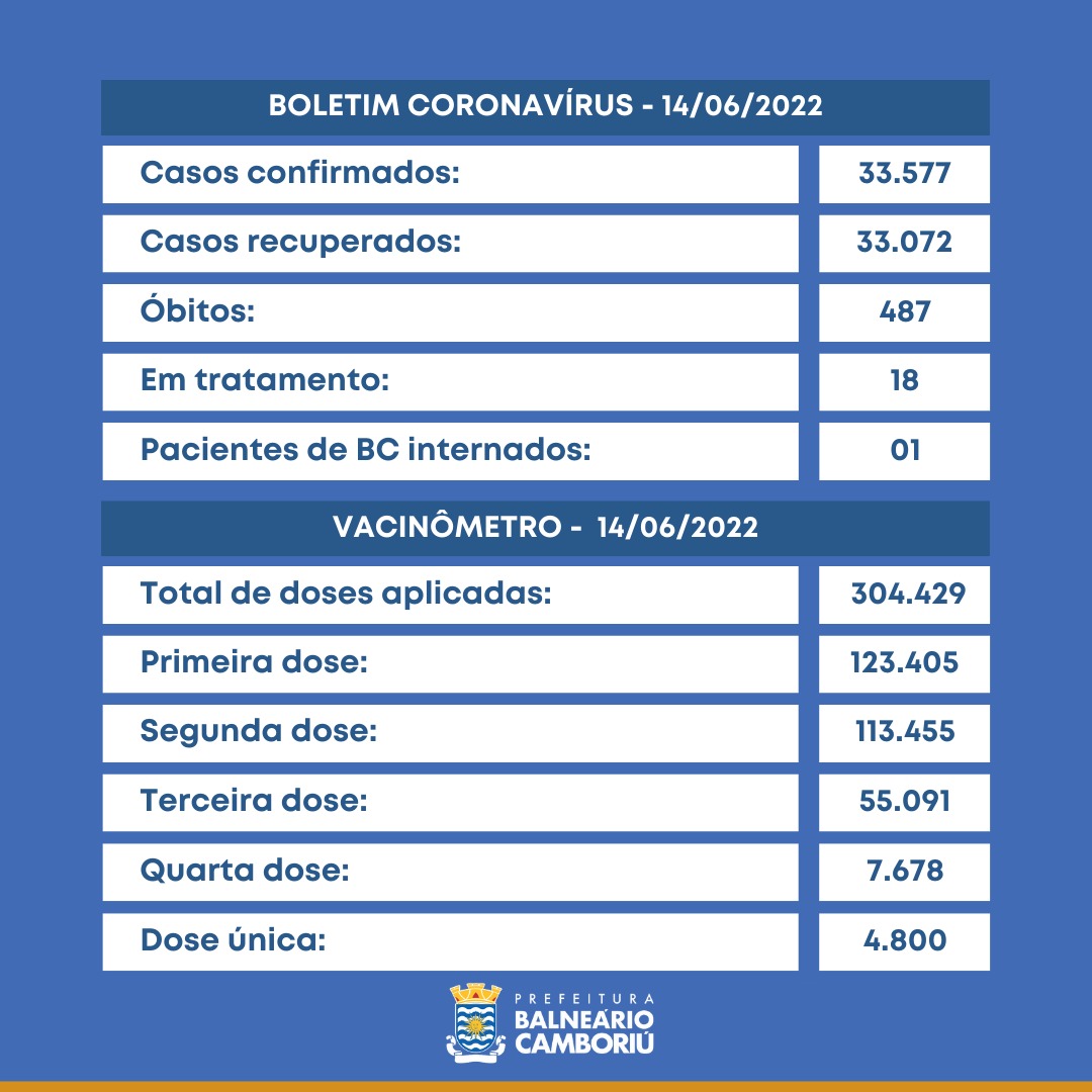 Neste terça-feira (14), Balneário Camboriú registrou 15 novos casos confirmados de Coronavírus. O município chega a 33.577 casos, sendo que 33.072 destes (98,4%) já estão recuperados e receberam alta. Permanecem em tratamento 18 pacientes, sendo 17 em domicílio e um internado.