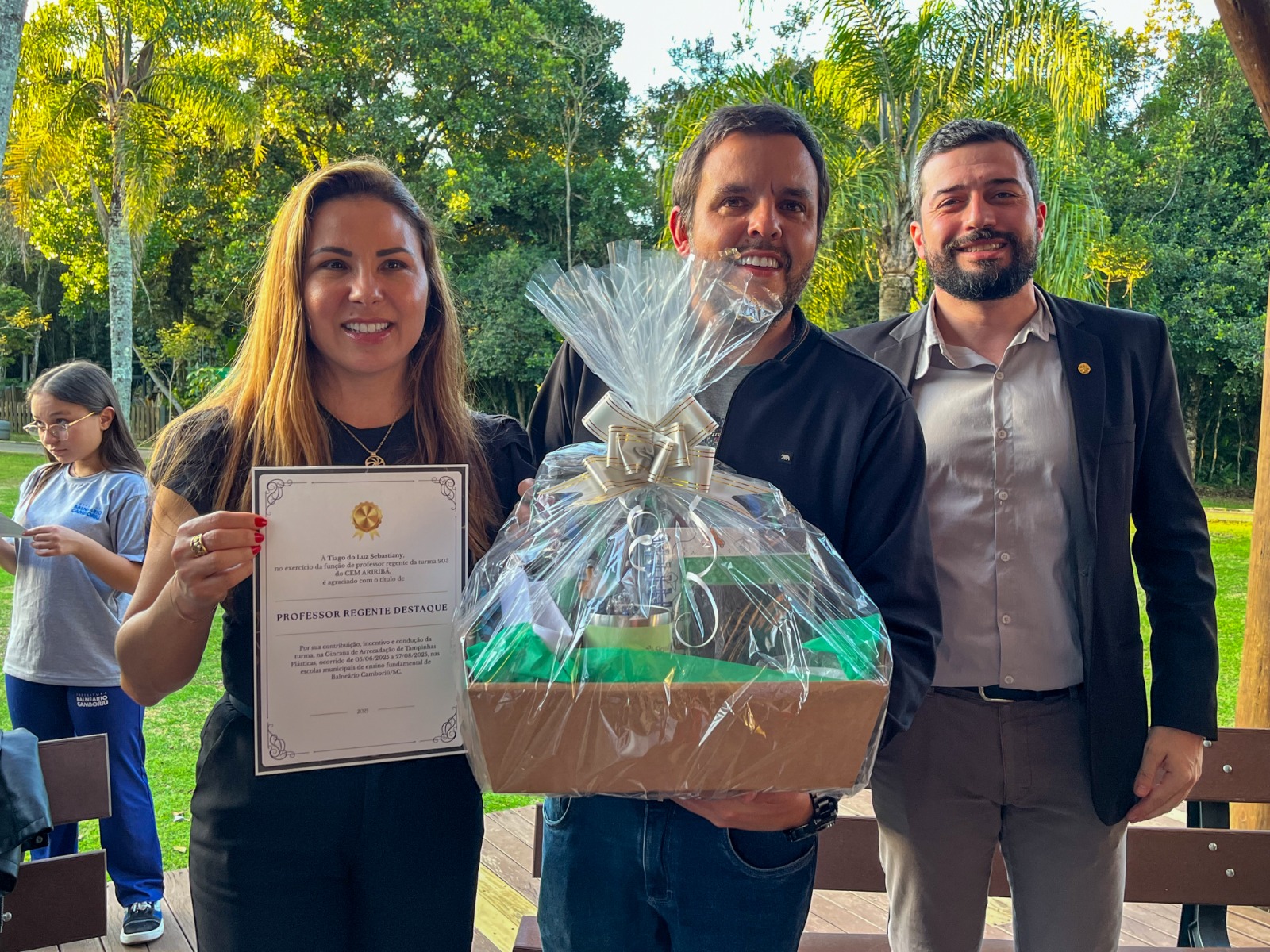 E para os professores regentes das turmas que mais arrecadaram, foram entregues cestas com brindes das cooperativas.