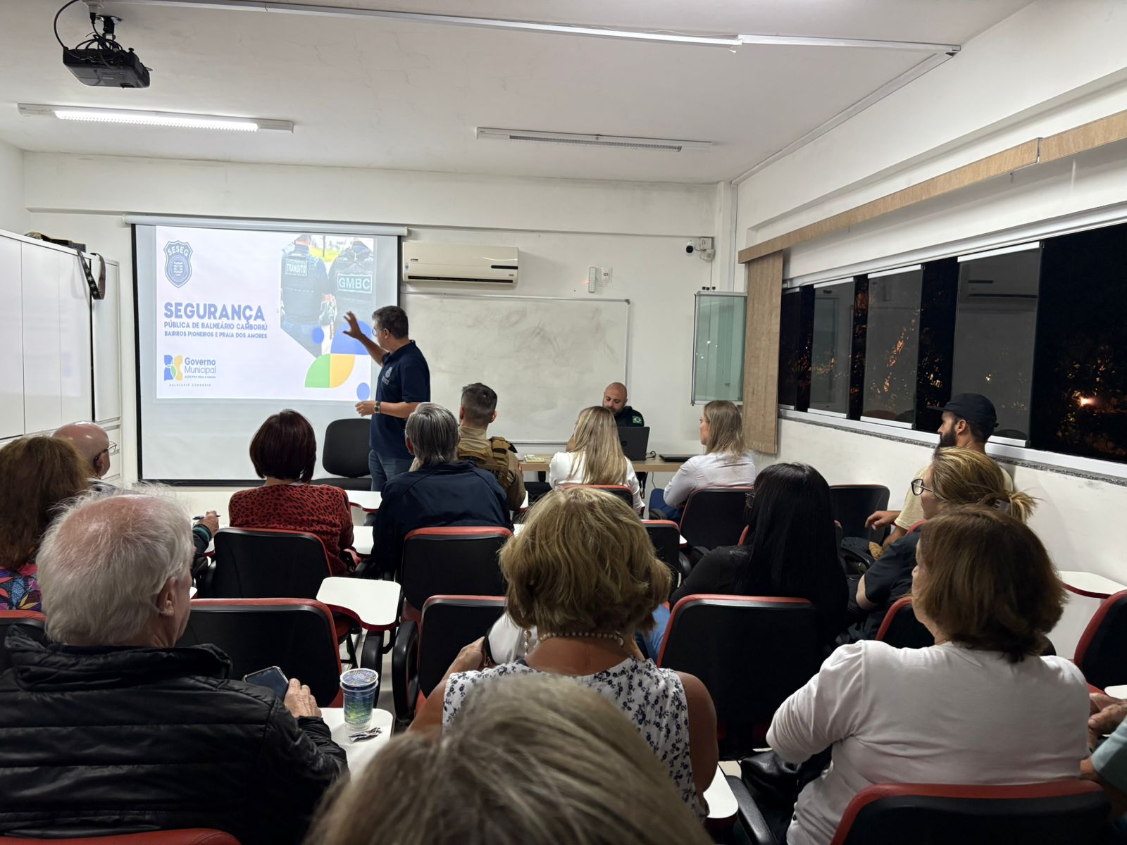 A Prefeitura de Balneário Camboriú, por meio da Secretaria de Segurança e Ordem Pública, participou na noite de quinta-feira (18) de uma reunião comunitária com moradores dos bairros Pioneiros e Praia dos Amores. O encontro aconteceu na base do Grupo de Busca e Salvamento (GBS) do Corpo de Bombeiros, localizada no Pontal Norte. Além de moradores, a reunião contou com a presença do comandante do 12° Batalhão da Polícia Militar, tenente-coronel Rafael Vicente, além de representantes do Corpo de Bombeiros Militar e vereadores.