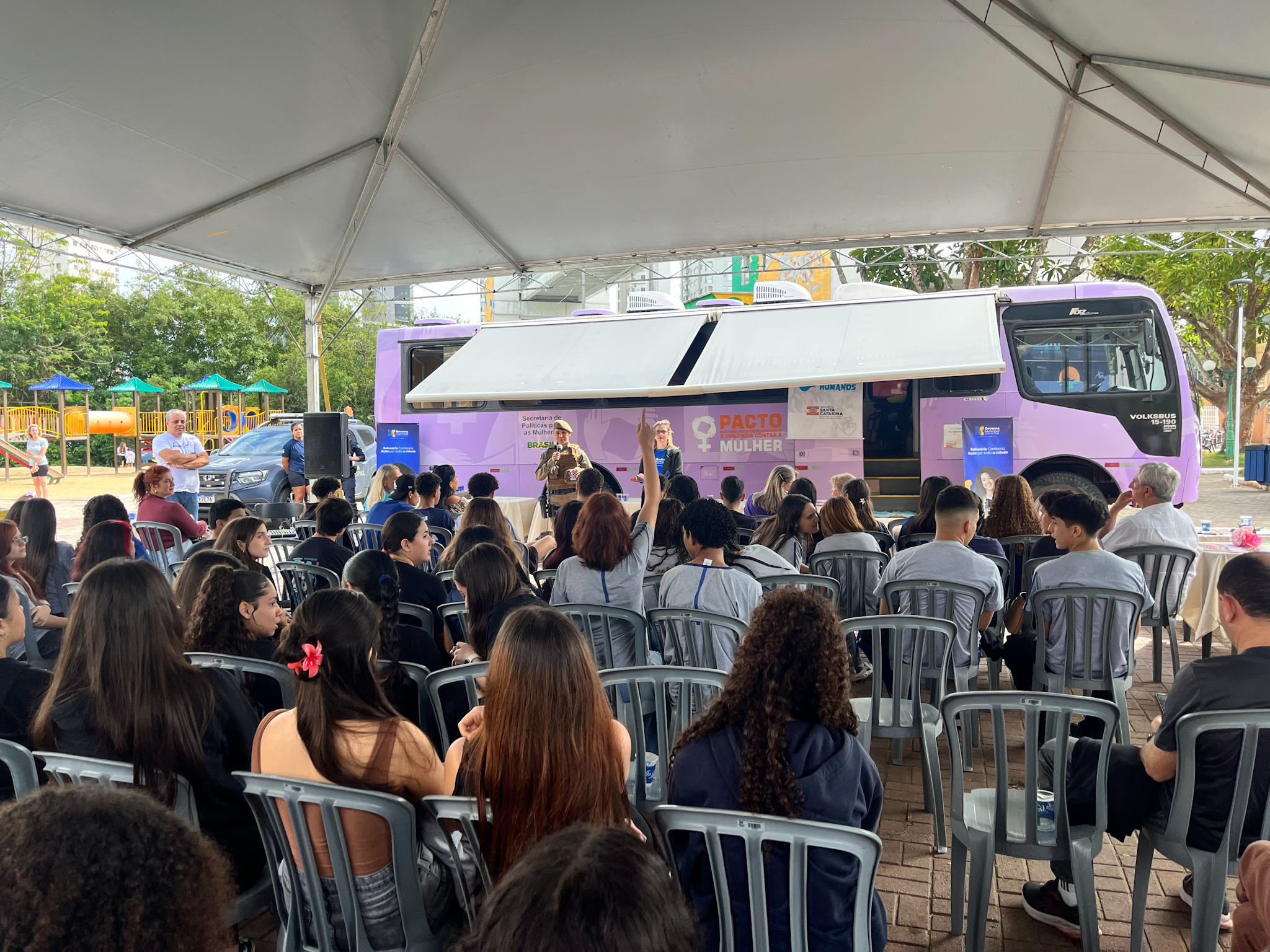 Balneário Camboriú recebeu, na quinta-feira (18), o Ônibus Lilás do Governo do Estado de Santa Catarina. Com programação voltada à conscientização sobre a violência contra a mulher, a iniciativa reuniu cerca de 400 participantes na Praça do Pescador – localizada no Bairro da Barra – e no Centro Educacional Municipal Vereador Santa – no Centro – das 9h às 17h.