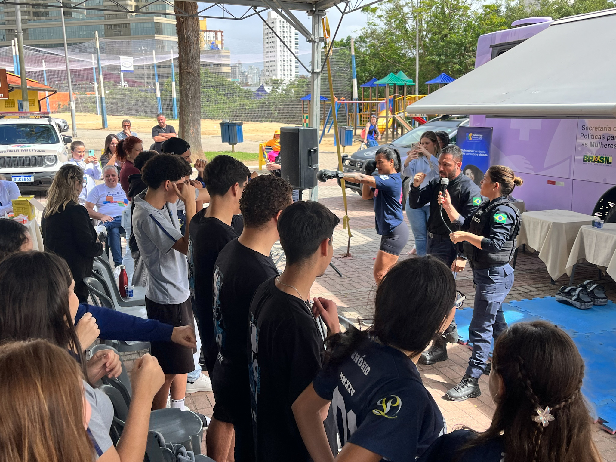 Com programação aberta à comunidade, a iniciativa buscou divulgar os serviços disponíveis em casos de violência contra a mulher, aproximar a população das redes de apoio locais e fortalecer a prevenção por meio da informação e conscientização. Viabilizada pela parceria firmada entre o Governo de Santa Catarina e a Prefeitura de Balneário Camboriú – por meio do Departamento de Políticas Públicas para a Mulher da Secretaria de Assistência Social, Mulher e Família –, contou com o apoio da Guarda Municipal, da Polícia Militar, da Polícia Civil, da Procuradoria Especial da Mulher, do Conselho Municipal de Direitos da Mulher, da Ordem dos Advogados do Brasil (OAB por Elas), da Rede Feminina de Combate ao Câncer, da Casa Alva, do Programa Abraço, da Universidade do Vale do Itajaí, do Conselho Tutelar e também das Secretarias Municipais de Educação, Saúde e Meio Ambiente e Desenvolvimento Econômico.