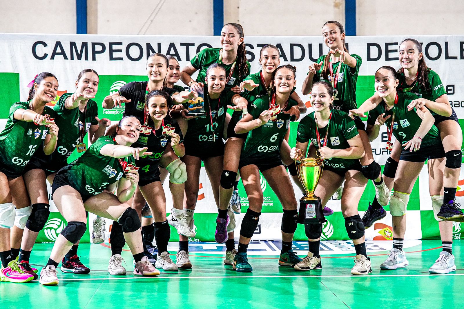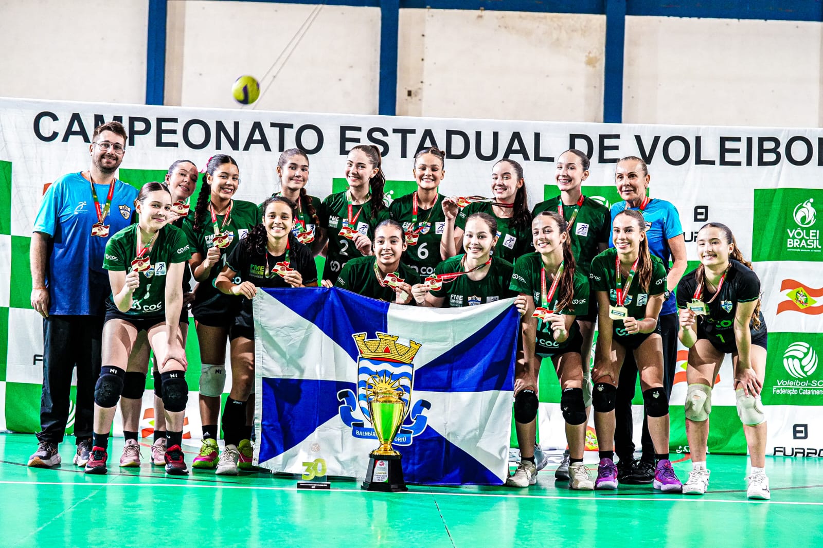 A equipe da Fundação Municipal de Esportes (FME) se consagrou campeã do Campeonato Estadual de Voleibol Feminino Sub-15, realizado no último fim de semana, no Ginásio de Esportes Irineu Bornhausen, em Balneário Camboriú. Os dois jogos da etapa final da competição foram disputados contra as equipes de Nova Trento e Lages.