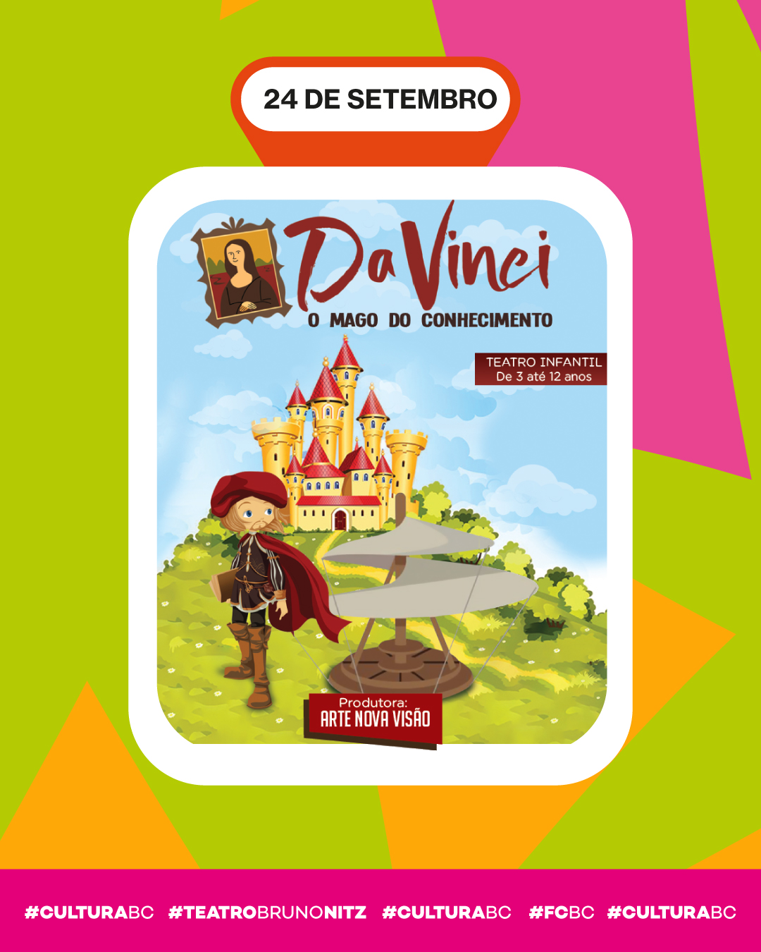 O espetáculo infantil “Leonardo Da Vinci - O Mago do Conhecimento” estará em cartaz no Teatro Municipal Bruno Nitz, em Balneário Camboriú, nesta quarta-feira (24). As apresentações vão ocorrer em duas sessões, às 10h e às 14h, especialmente para o público de três a 12 anos de idade.