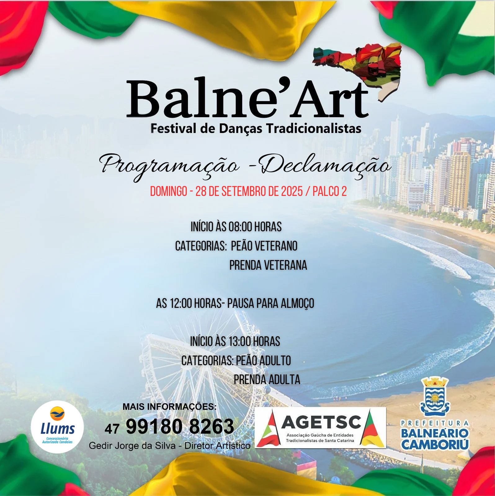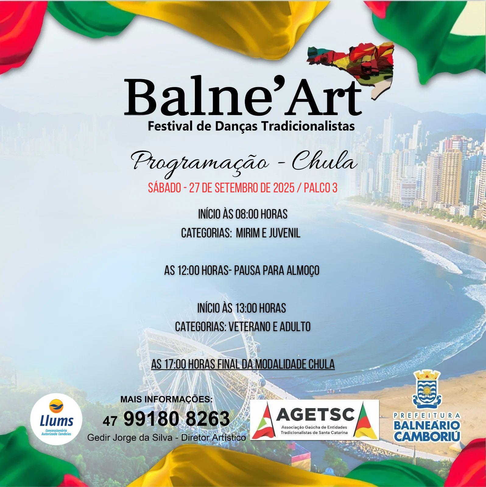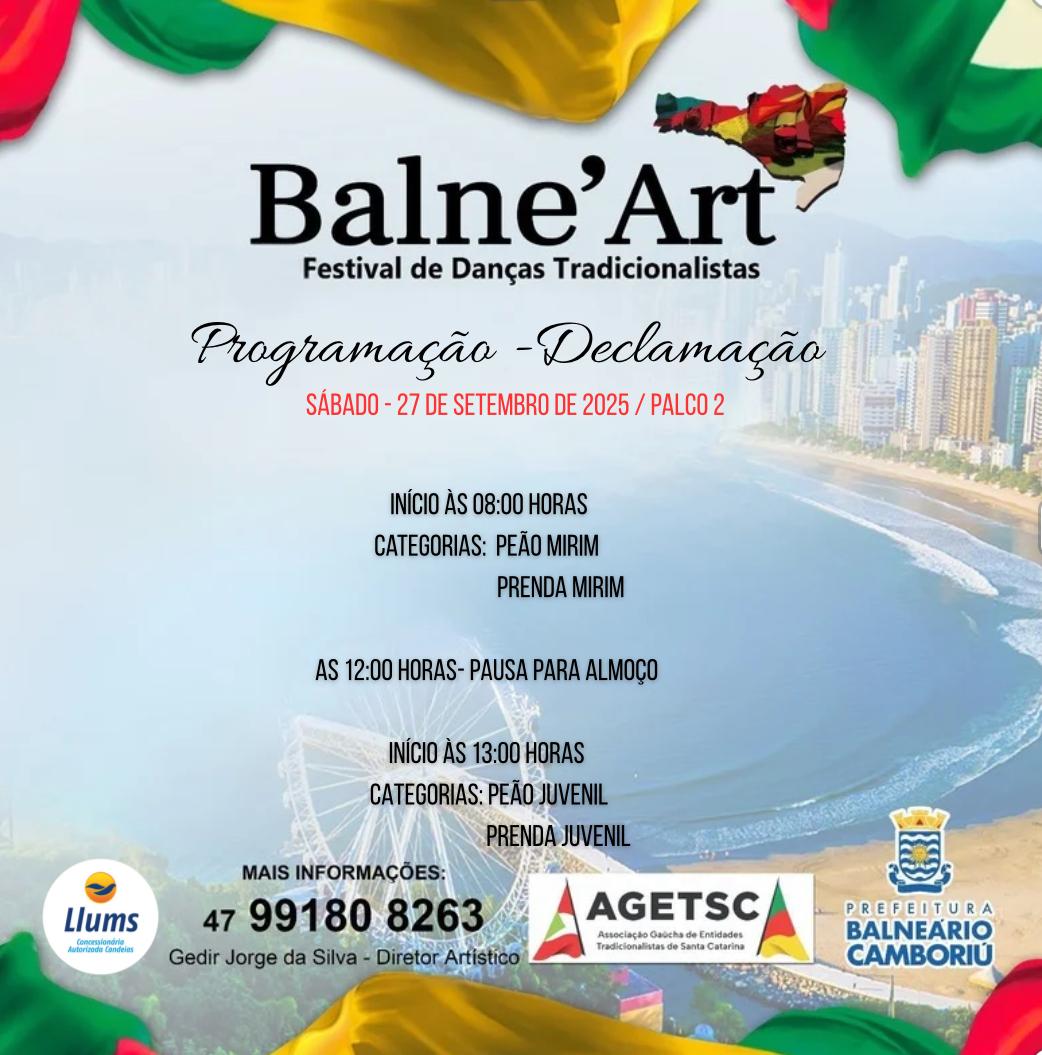 Já o Balne'Art, concurso artístico de danças tradicionais e de salão, chula, declamação e solista vocal, começa às 7h30 de sábado. Com programação nos dois dias de manhã e à tarde, o Balne'Art tem mais de mil pessoas envolvidas, que vêm ao Acampamento Farroupilha de Balneário Camboriú para dançar, cantar e declamar.