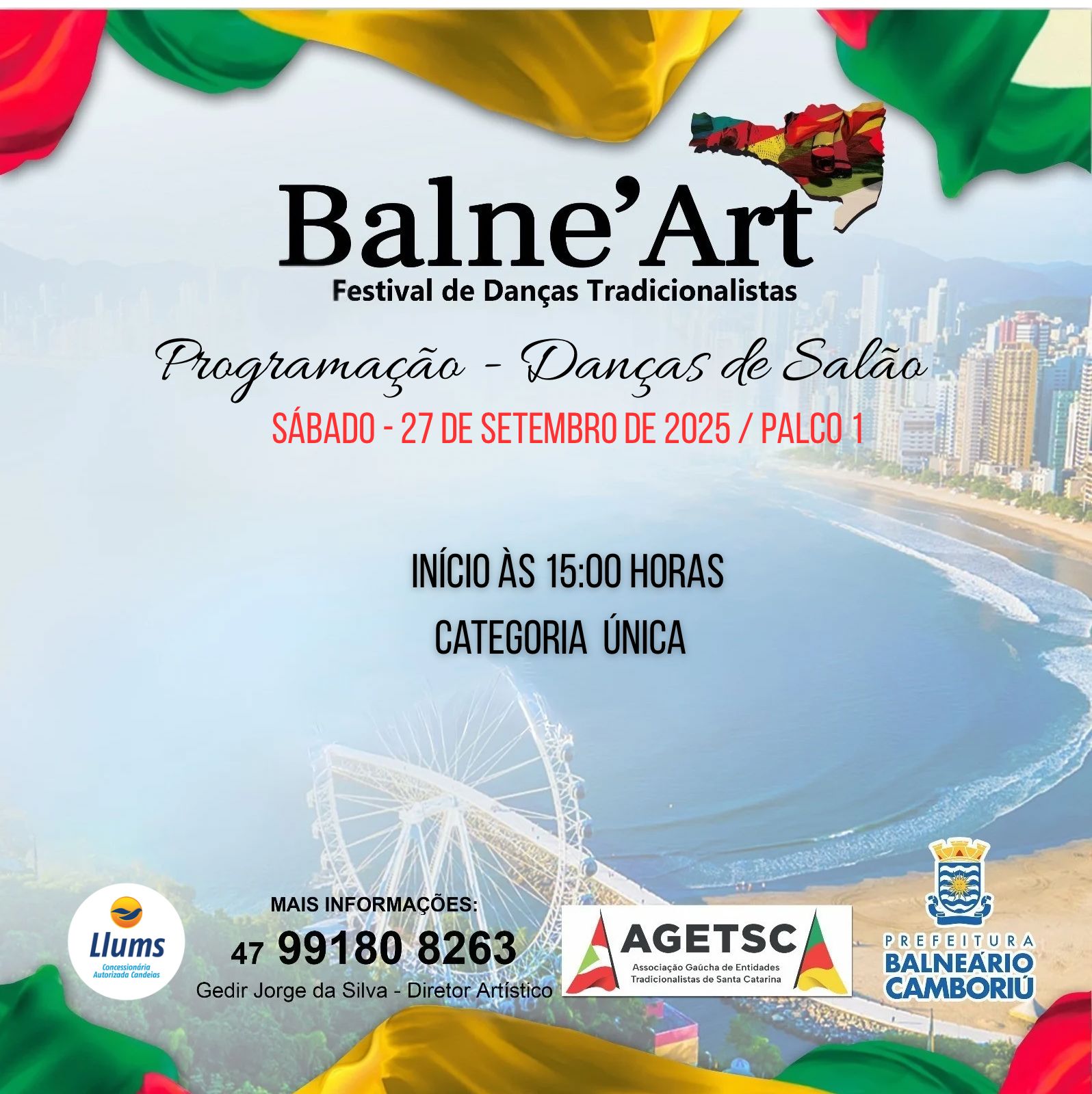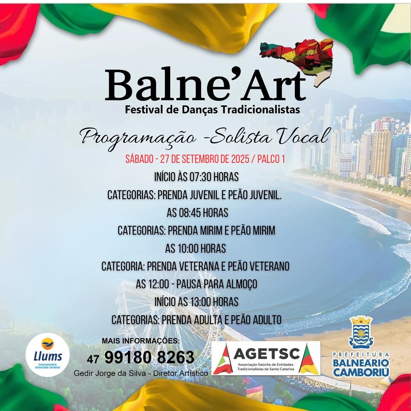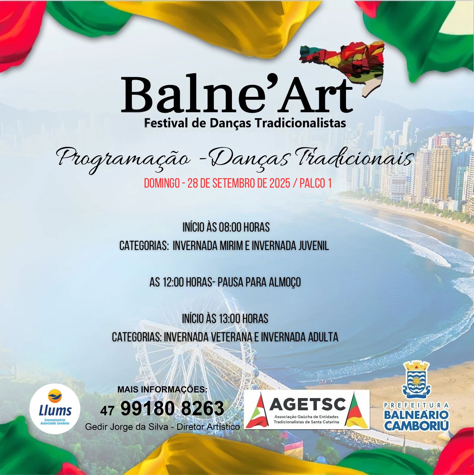 Já o Balne'Art, concurso artístico de danças tradicionais e de salão, chula, declamação e solista vocal, começa às 7h30 de sábado. Com programação nos dois dias de manhã e à tarde, o Balne'Art tem mais de mil pessoas envolvidas, que vêm ao Acampamento Farroupilha de Balneário Camboriú para dançar, cantar e declamar.