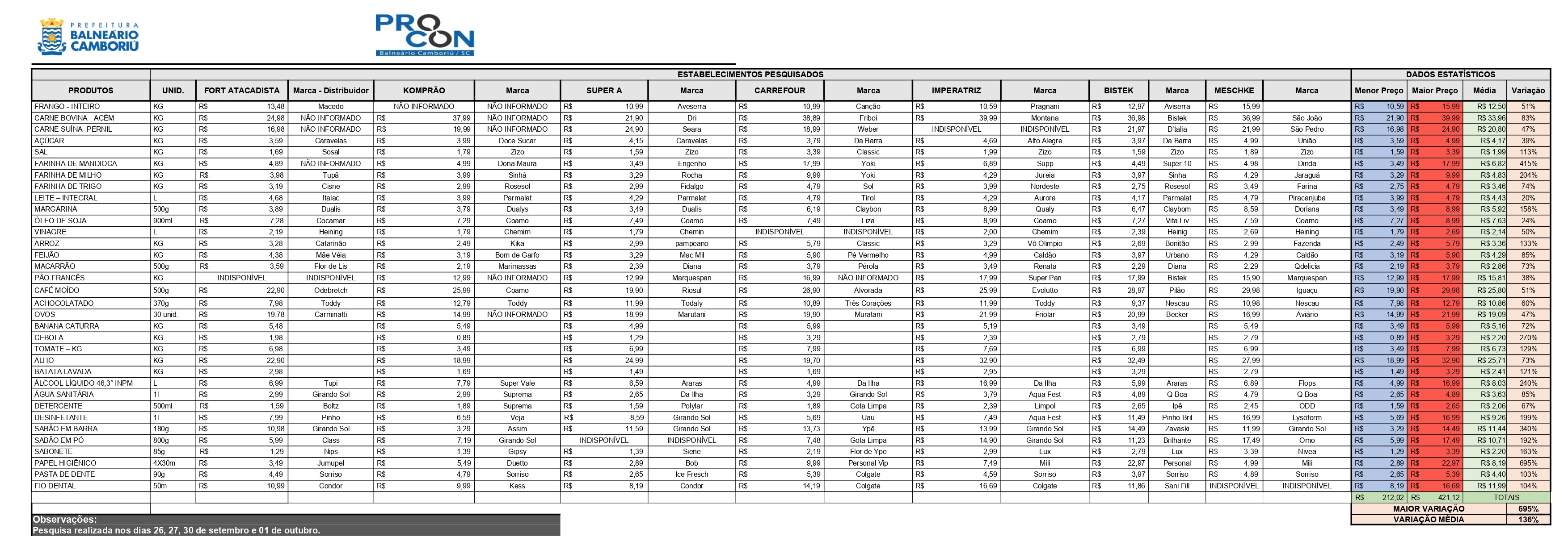 Em anexo, planilha completa da pesquisa de outubro e sonora do diretor do Procon de Balneário Camboriú, Bruno Costa.