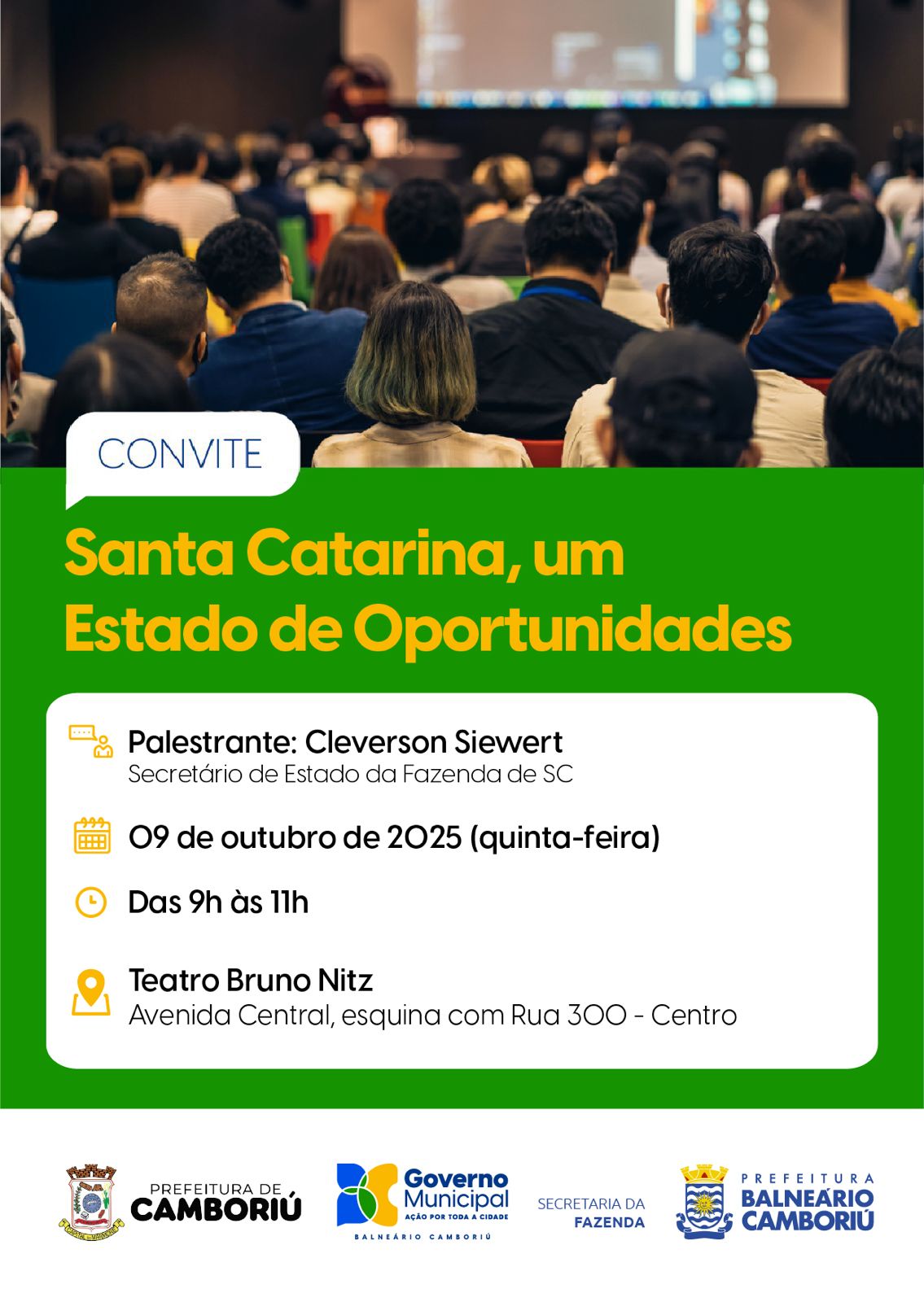 A Prefeitura de Balneário Camboriú, em conjunto com a Prefeitura de Camboriú, irá promover no município a palestra "Santa Catarina, um Estado de oportunidades", ministrada pelo secretário de Estado da Fazenda de Santa Catarina, Cleverson Siewert. O evento, que será realizado na quinta-feira (9), é destinado a empresários, lideranças e ao público em geral, além dos servidores e gestores públicos municipais.