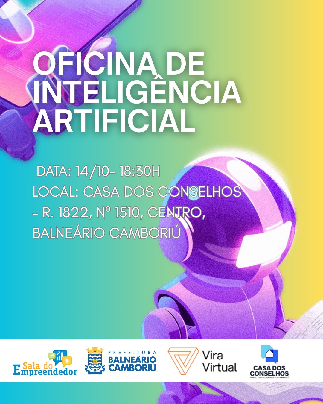 A Prefeitura de Balneário Camboriú promoverá, na próxima semana, uma oficina gratuita sobre inteligência artificial (IA) para moradores que empreendem ou têm interesse em empreender. A atividade ocorrerá na Casa dos Conselhos (Rua 1822, nº 1510, Centro), terça-feira (14), às 18h30.