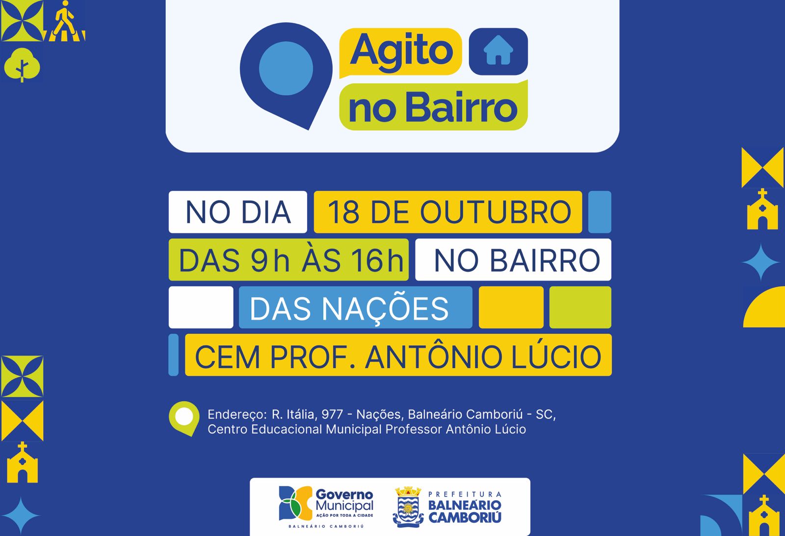 Neste sábado (18), a Prefeitura de Balneário Camboriú, por meio da Secretaria de Assistência Social, Mulher e Família e em parceria com as demais secretarias e autarquias municipais, promove a segunda edição do Agito no Bairro. O evento será realizado das 9h às 16h, no Centro de Educação Municipal (CEM) Professor Antônio Lúcio, localizado na Rua Itália, no Bairro das Nações. Na oportunidade, serão oferecidos, gratuitamente, diversos serviços (veja lista abaixo) e atrações para a comunidade em geral. Mesmo com chuva, o evento será realizado.