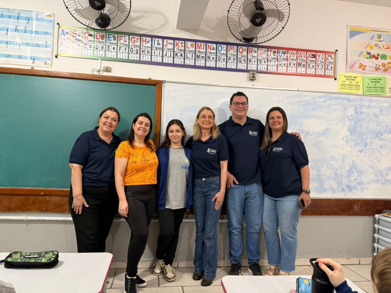 Participaram do debate a secretária da Fazenda, Magda Bez, o diretor de Fiscalização Fazendária, Cláudio Kraus, a diretora do Programa de Educação Fiscal e Financeira, Angela Maria Simão Hoemke, e a assessora pedagógica Luciana Copet; além da professora Jaqueline Moraes e da diretora da escola, Laura Hofmann.