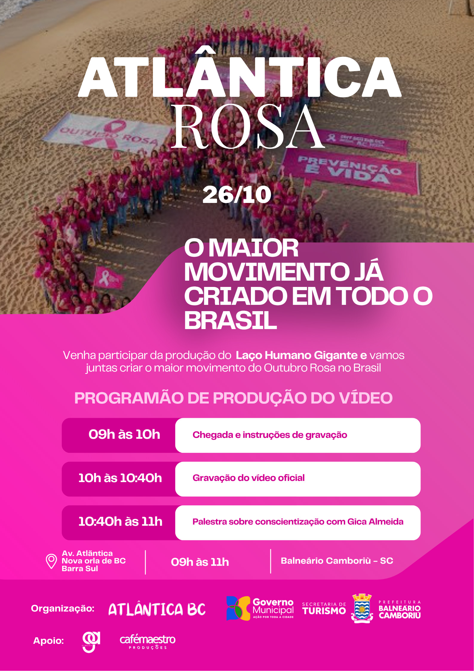 No próximo domingo (26), um laço humano gigante será formado nas areias da Praia Central de Balneário Camboriú, em uma ação inédita de apoio à campanha Outubro Rosa de combate ao câncer de mama. A iniciativa é uma parceria entre a Prefeitura de Balneário Camboriú, por meio da Secretaria de Turismo, com a marca Atlântica BC.