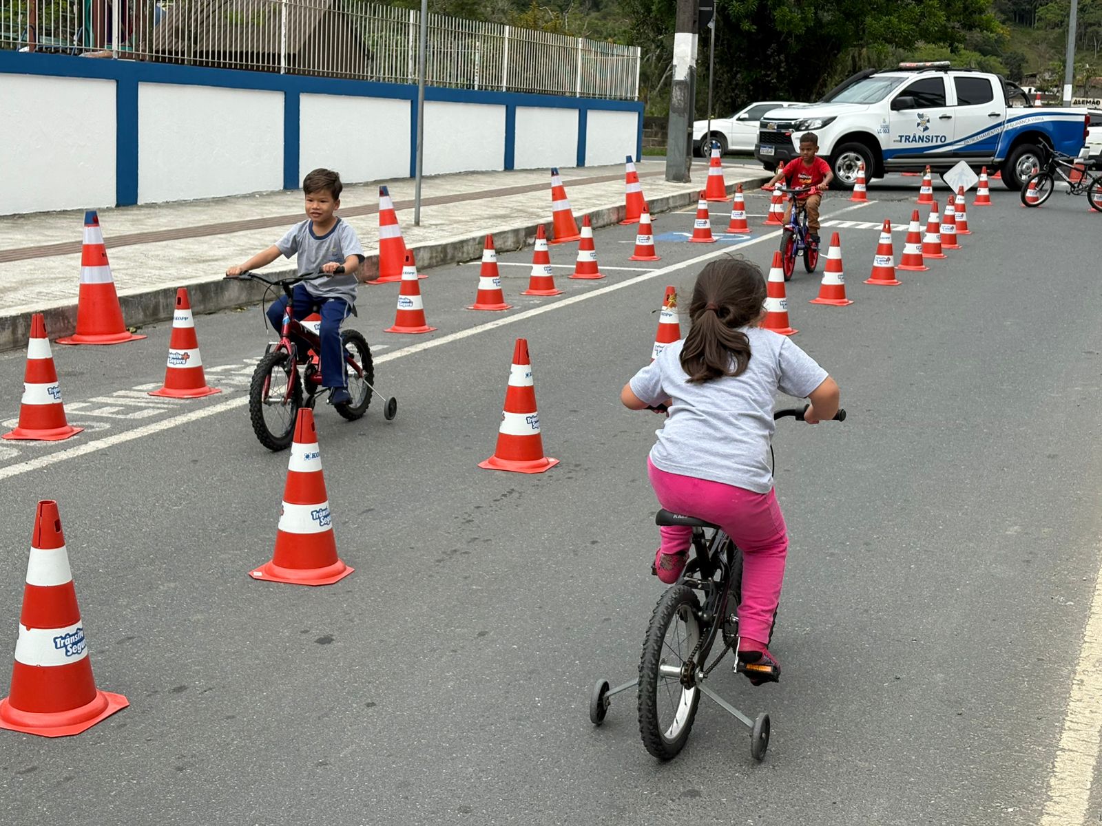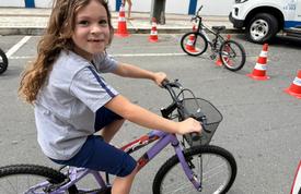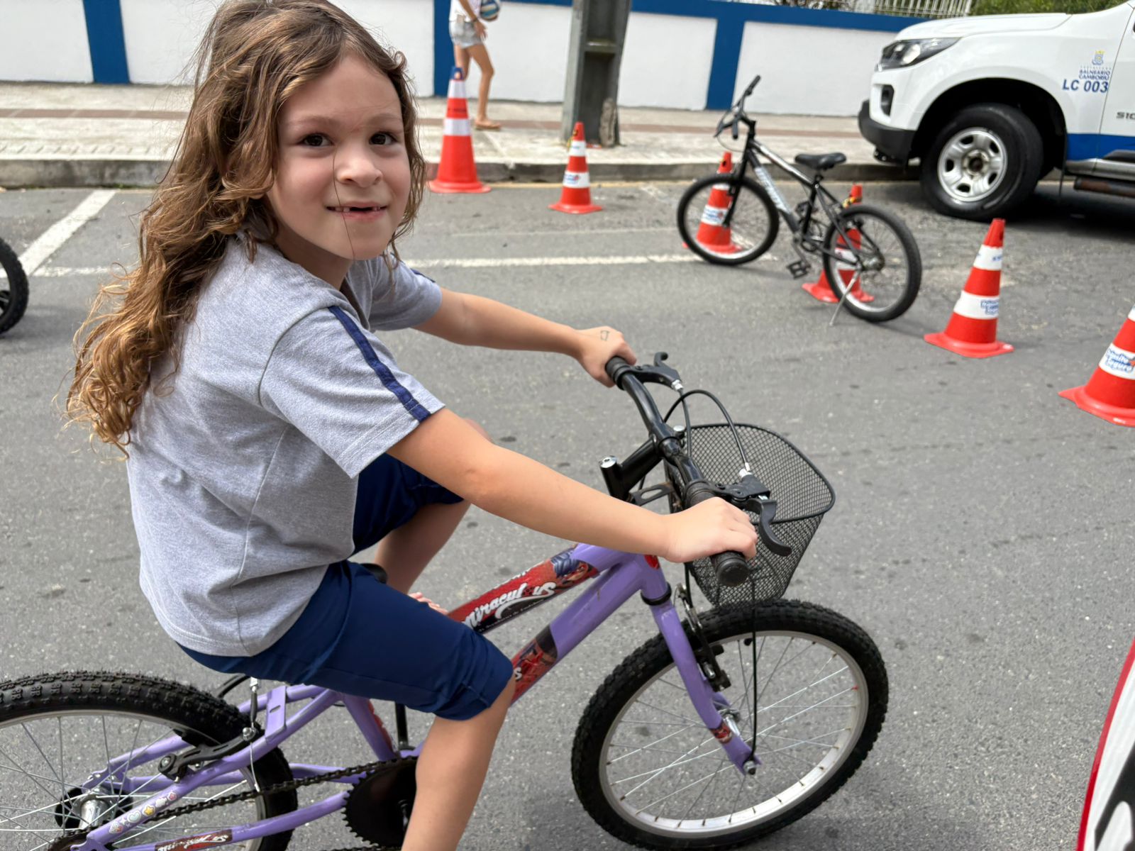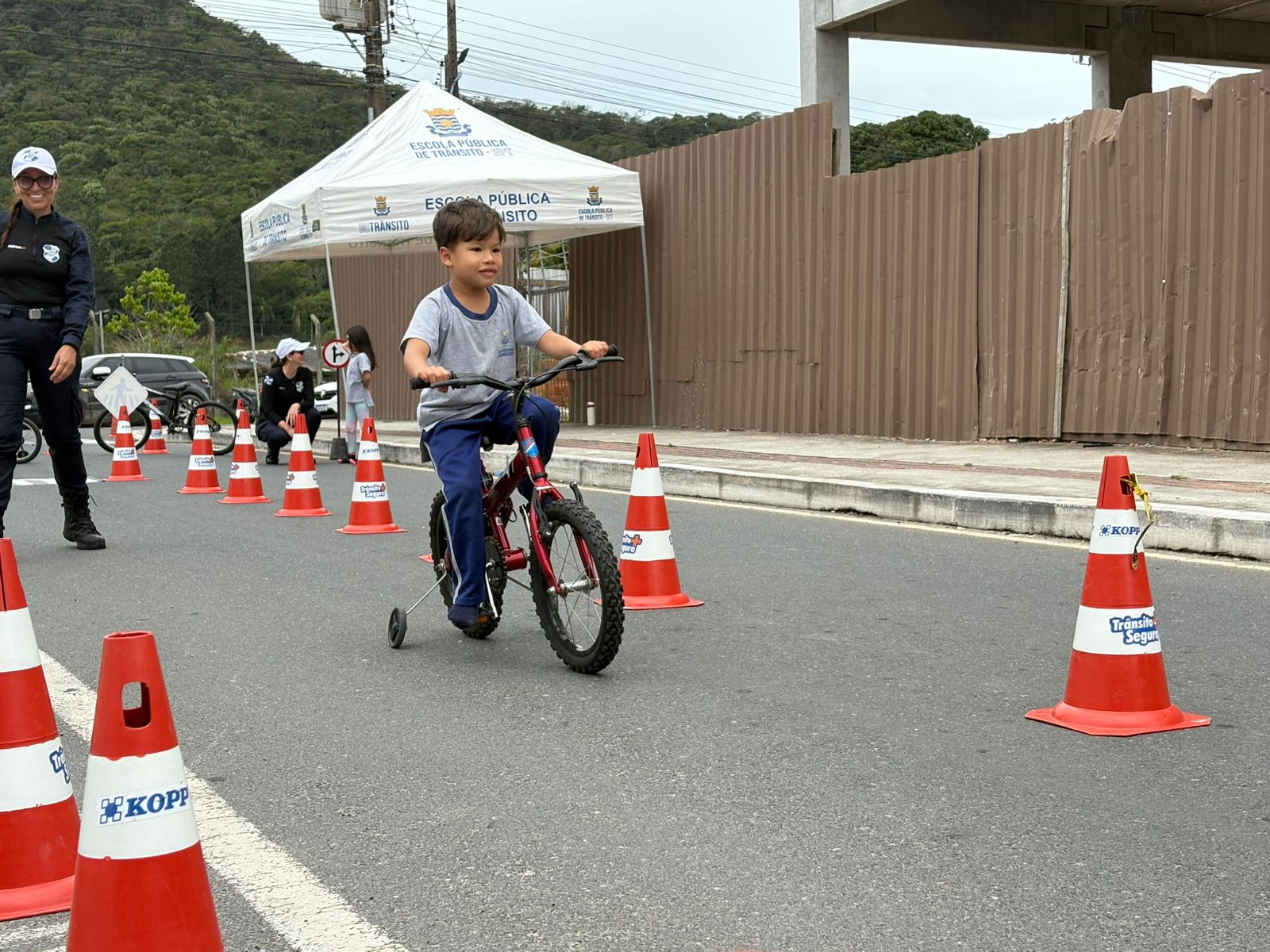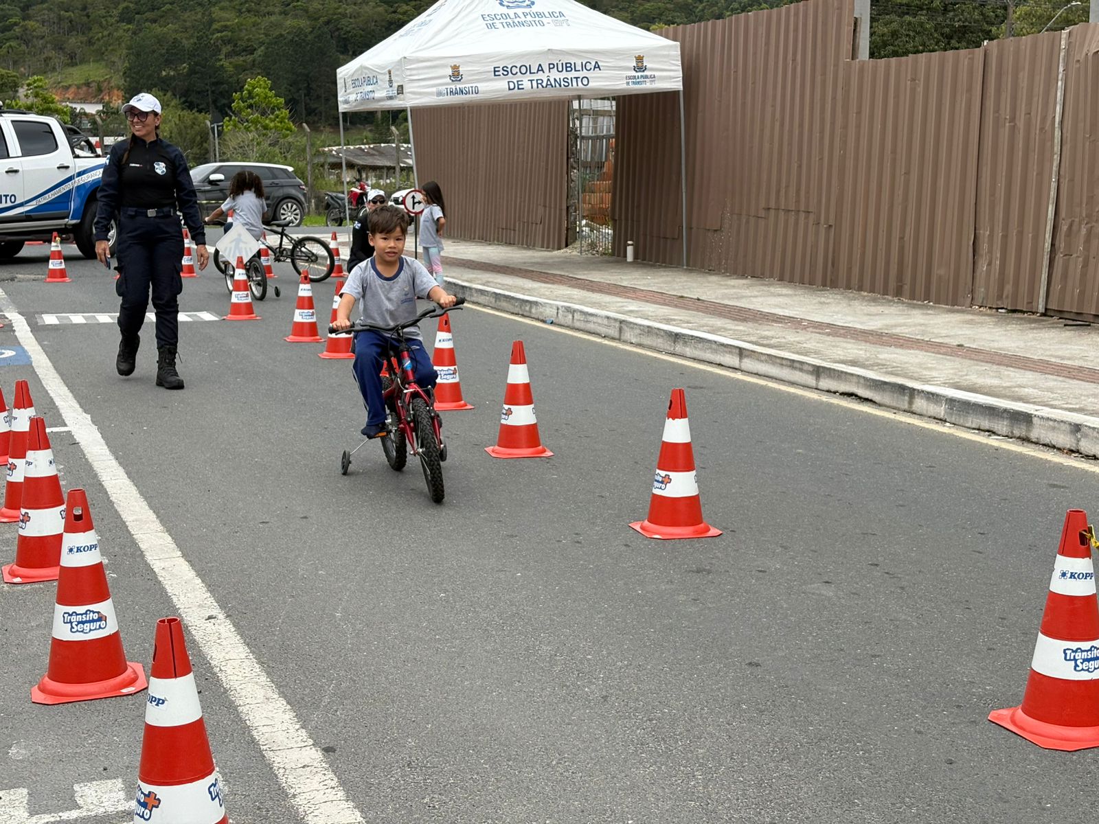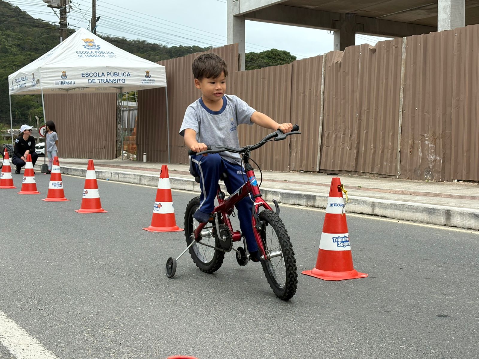A ação, coordenada pela Escola Pública de Trânsito (EPT), levou às crianças brinquedos infláveis e um circuito de bicicleta para colocar em prática regras básicas viárias, aliando aprendizado e diversão. A intenção é que as orientações sejam repassadas de forma lúdica e compartilhadas com a família pela própria criança posteriormente.