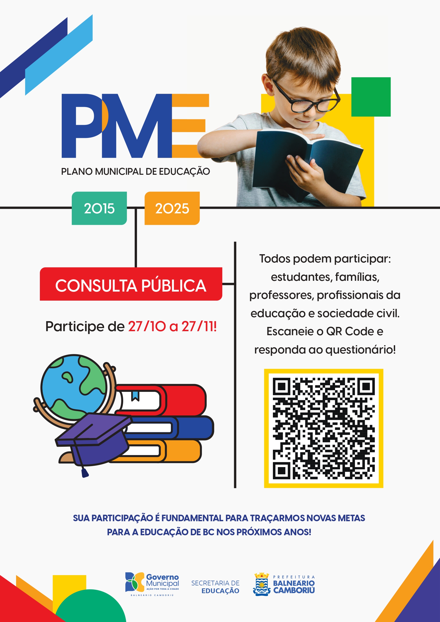 A Prefeitura de Balneário Camboriú, por meio da Secretaria de Educação (Seduc), informa a abertura da consulta pública que avalia o Plano Municipal de Educação (PME) vigente. O questionário pode ser acessado e respondido por meio do link https://docs.google.com/forms/d/e/1FAIpQLSddBQevCBkiiuIAa2b7dM_19WNrhSV5w9eeOwN-FsLHCAgrqw/viewform?fbzx=-8537140145966221098 a partir de segunda-feira (27) e ficará disponível por 30 dias.