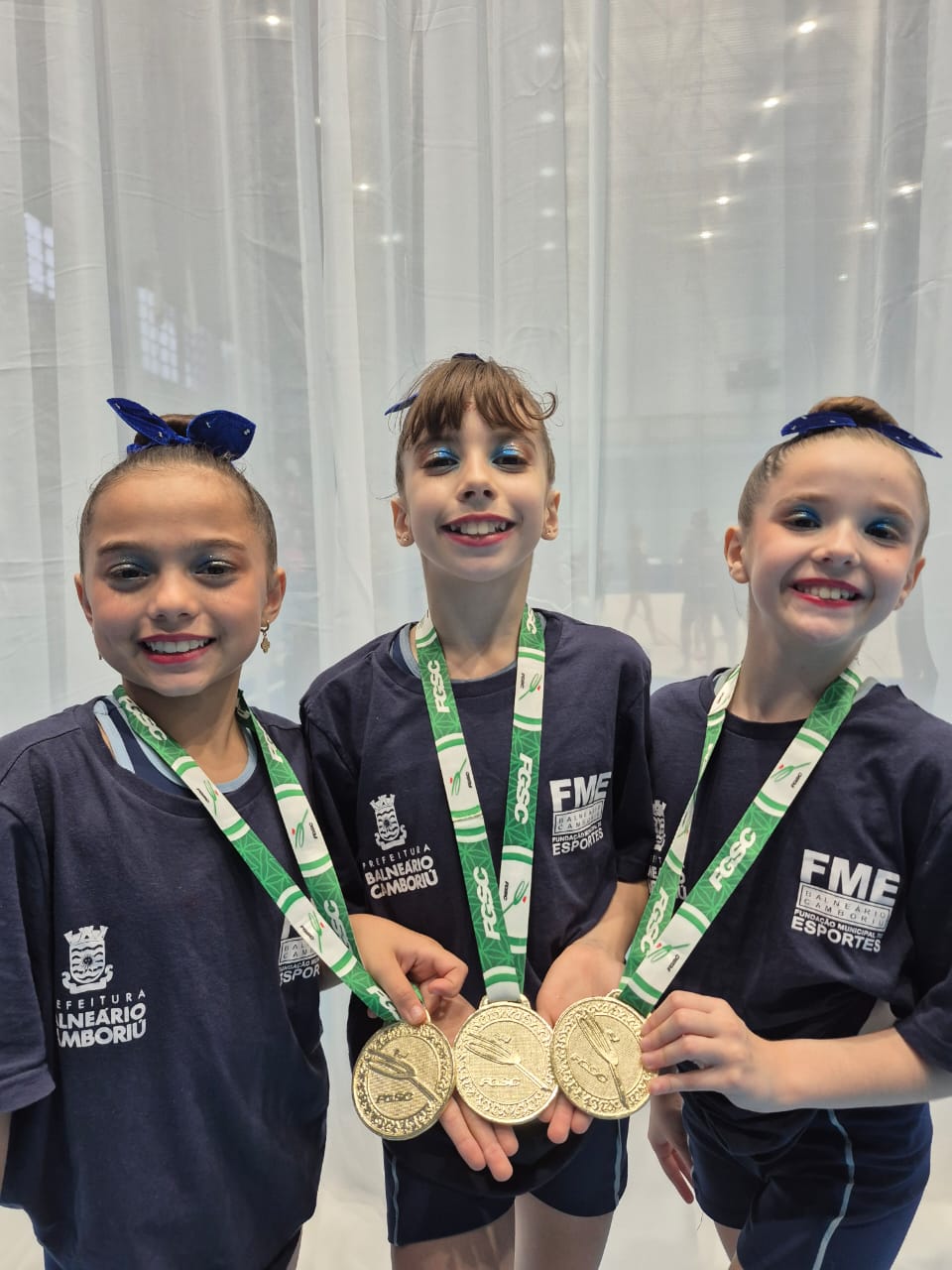 Atletas da Fundação Municipal de Esportes (FME) de Balneário Camboriú garantiram um feito inédito para o município no Campeonato Estadual de Conjuntos de Ginástica Rítmica, realizado no sábado (1º), em Florianópolis. Sarah Ximenes, Carolina Kurata e Alice Vinhal conquistaram o título de campeãs na categoria trio pré-infantil (10 anos), no aparelho 3 bolas.