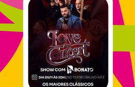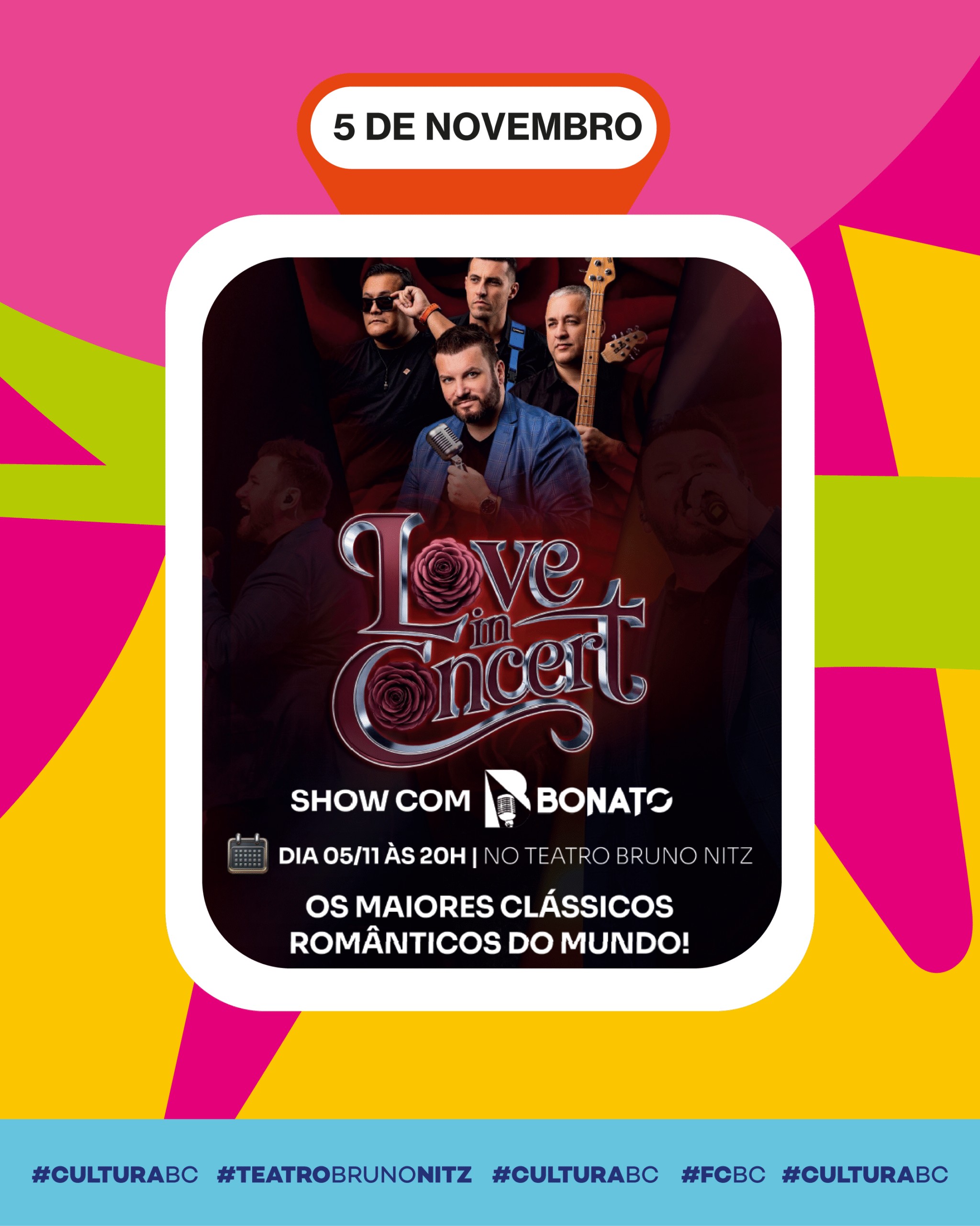 A Bonato Band estreia o espetáculo “Love In Concert” no Teatro Municipal Bruno Nitz, em Balneário Camboriú, nesta quarta-feira (5). Os ingressos para o show, que começa às 20h, estão à venda pela plataforma https://lets.events.