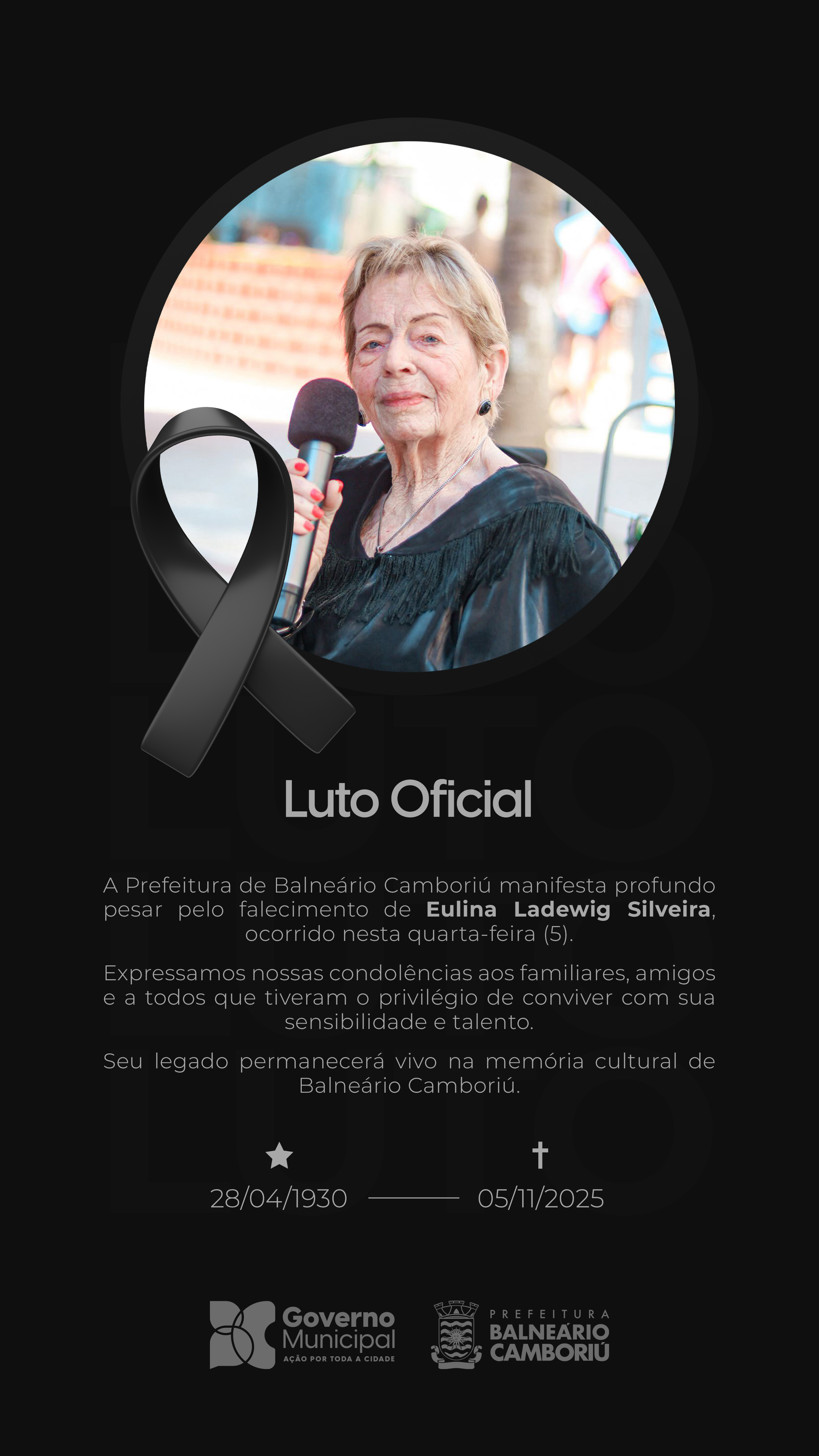 A Prefeitura de Balneário Camboriú manifesta profundo pesar pelo falecimento de Eulina Ladewig Silveira, de 95 anos, ocorrido na quarta-feira (5). Em respeito a sua história e dedicação à promoção da cultura na cidade, o município declarou luto oficial de três dias, por meio do Decreto n° 12.781.