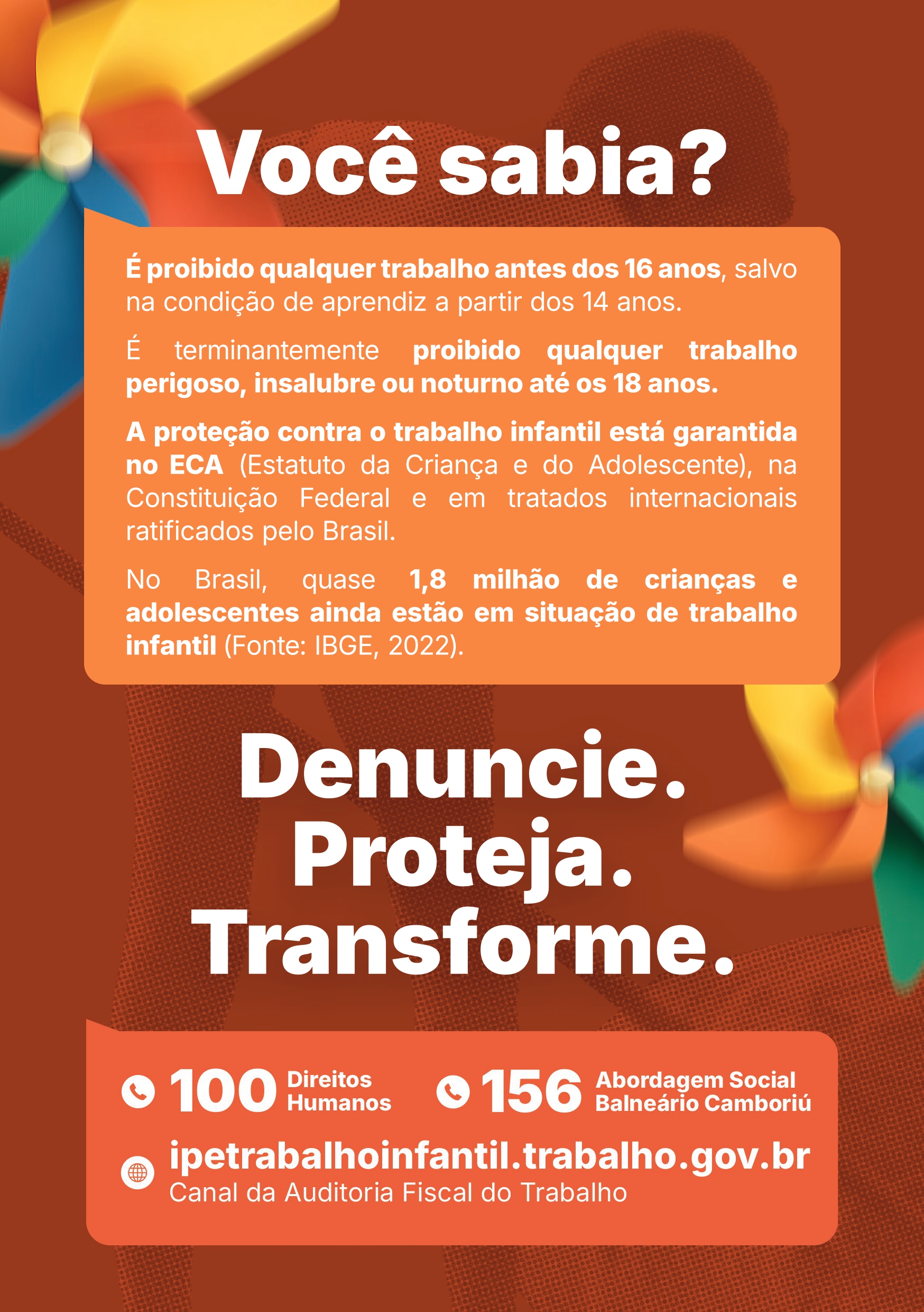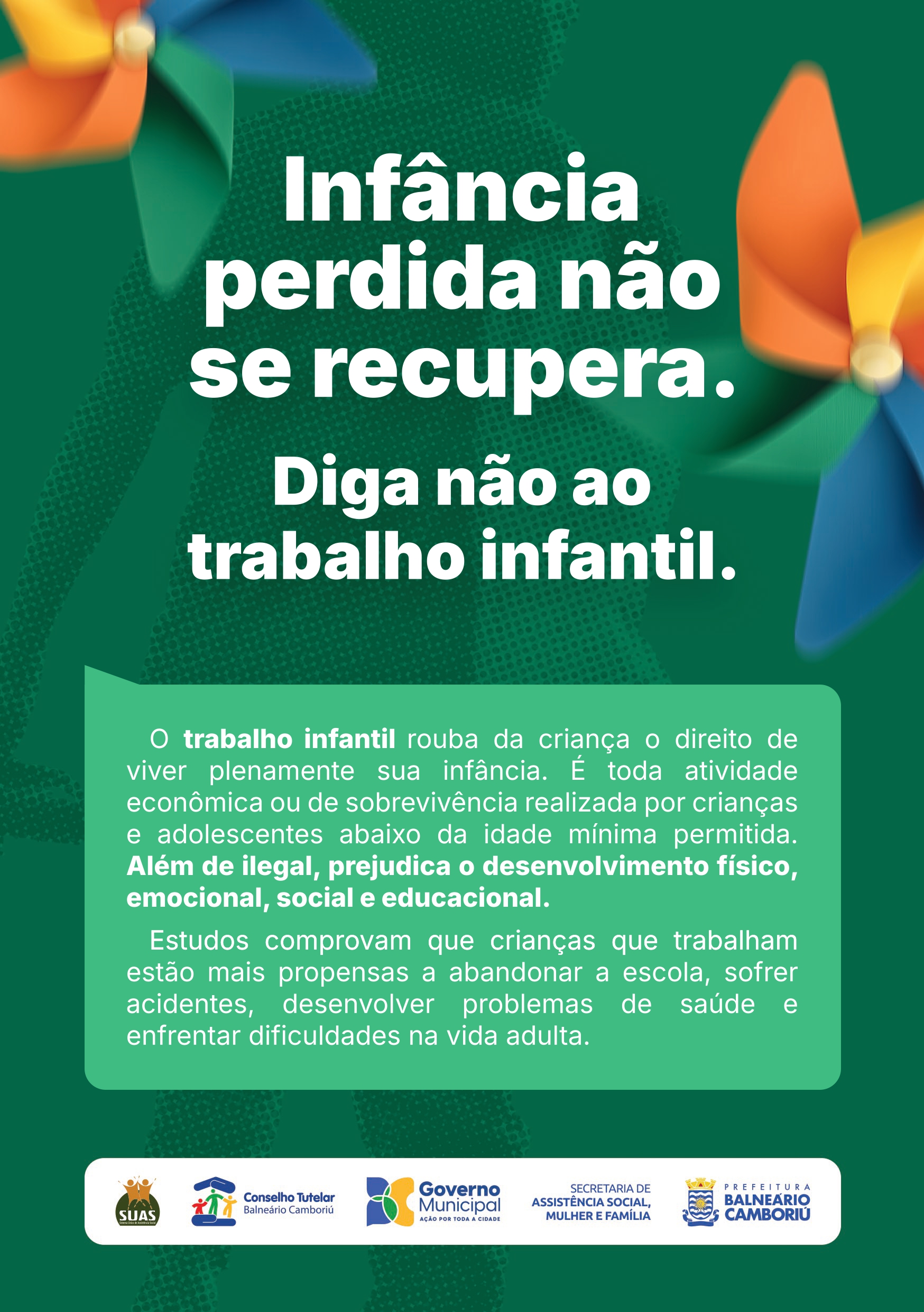 O Conselho Tutelar de Balneário Camboriú promove, em parceria com a Secretaria de Assistência Social, Mulher e Família, a campanha "Infância perdida não se recupera - Diga não ao trabalho infantil". A ação será realizada na quinta-feira (27), em três pontos estratégicos da cidade.