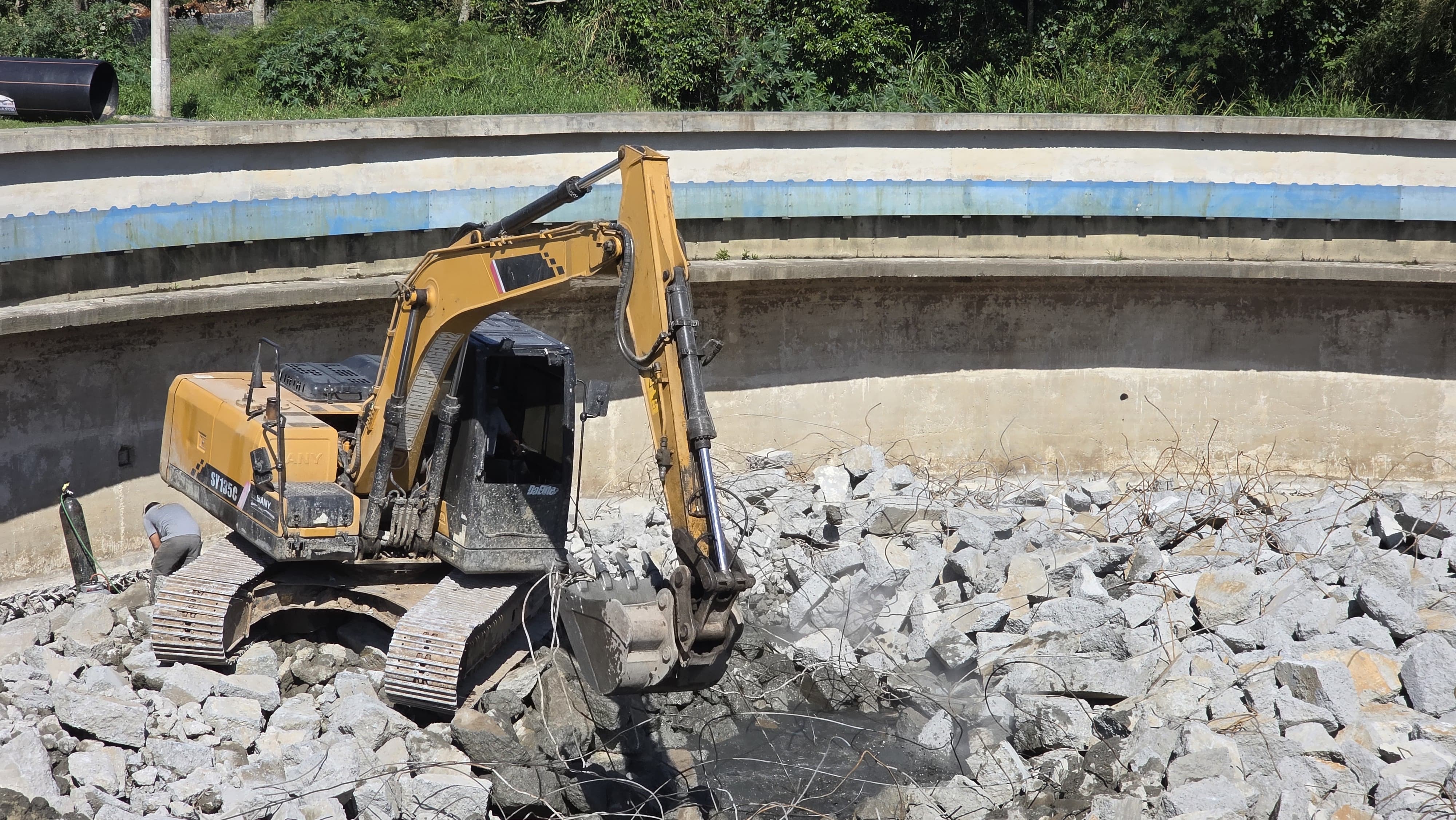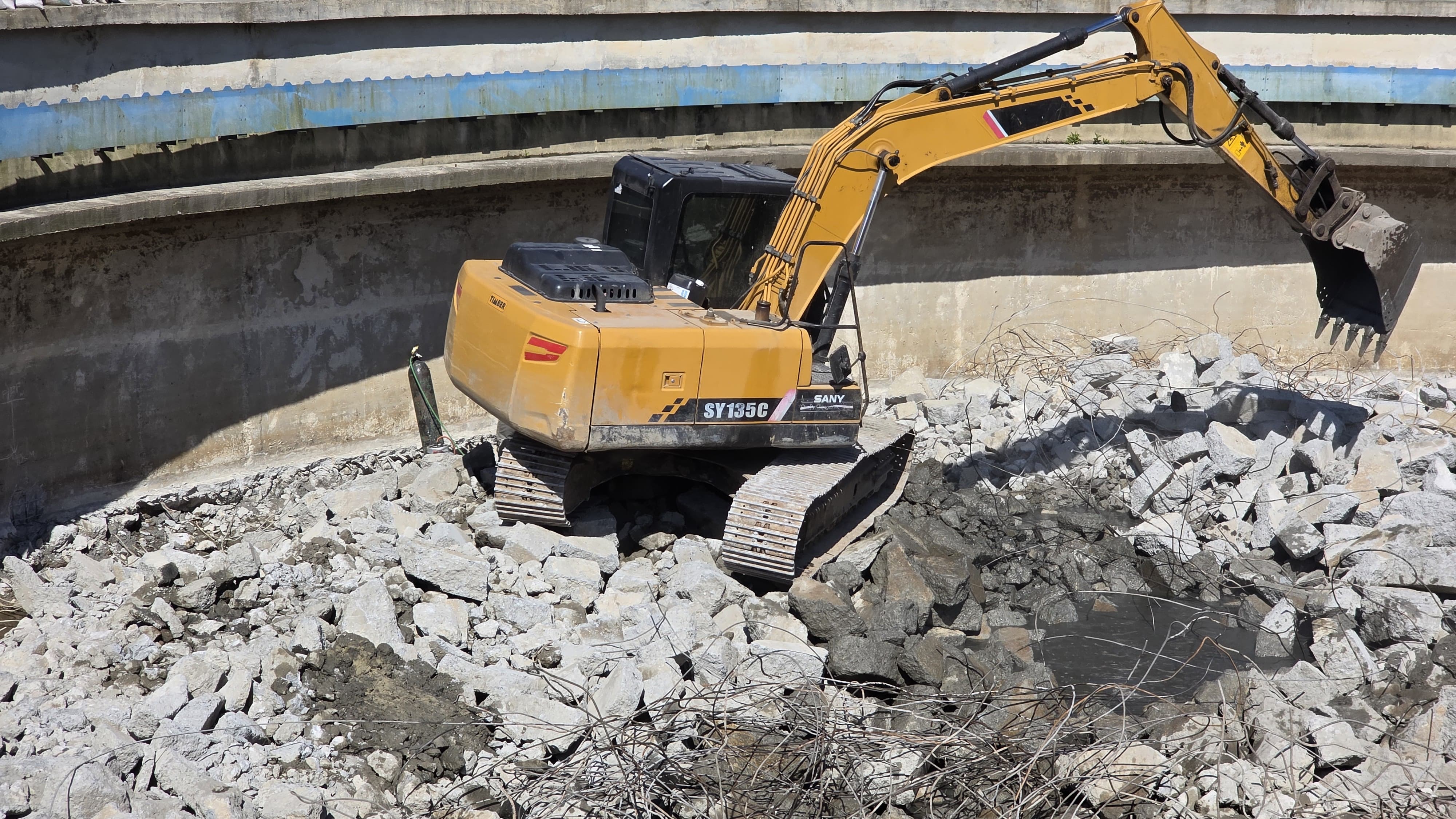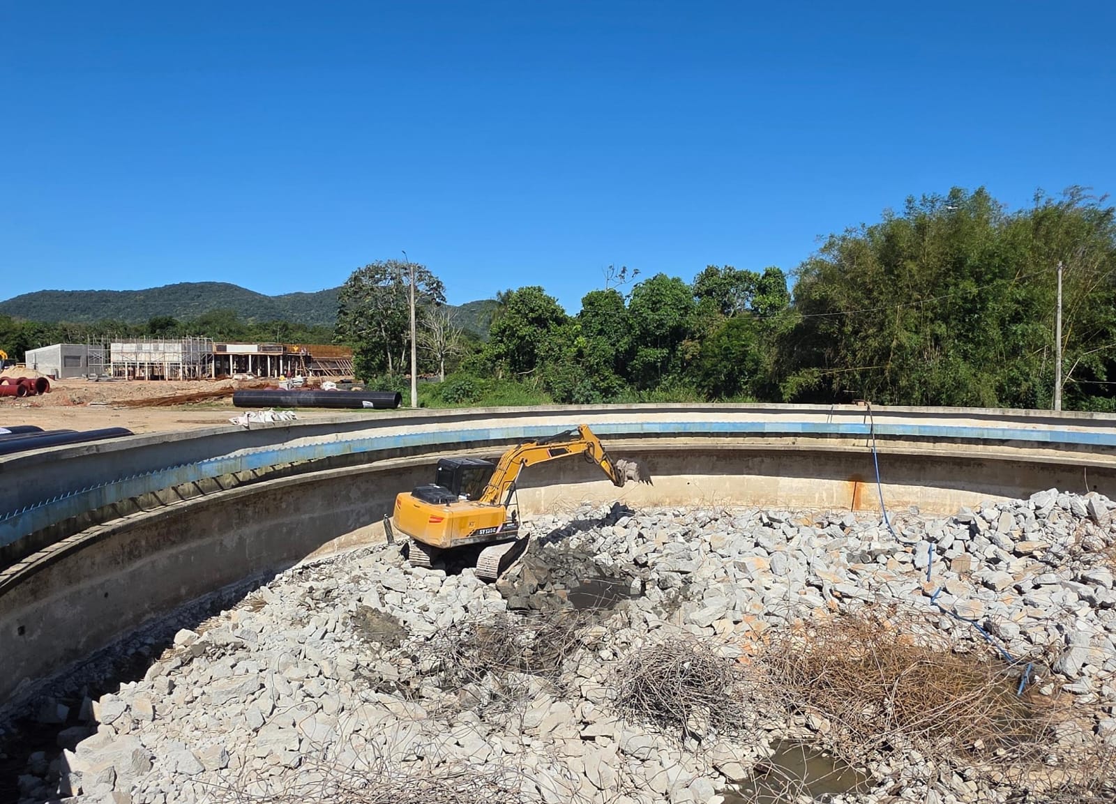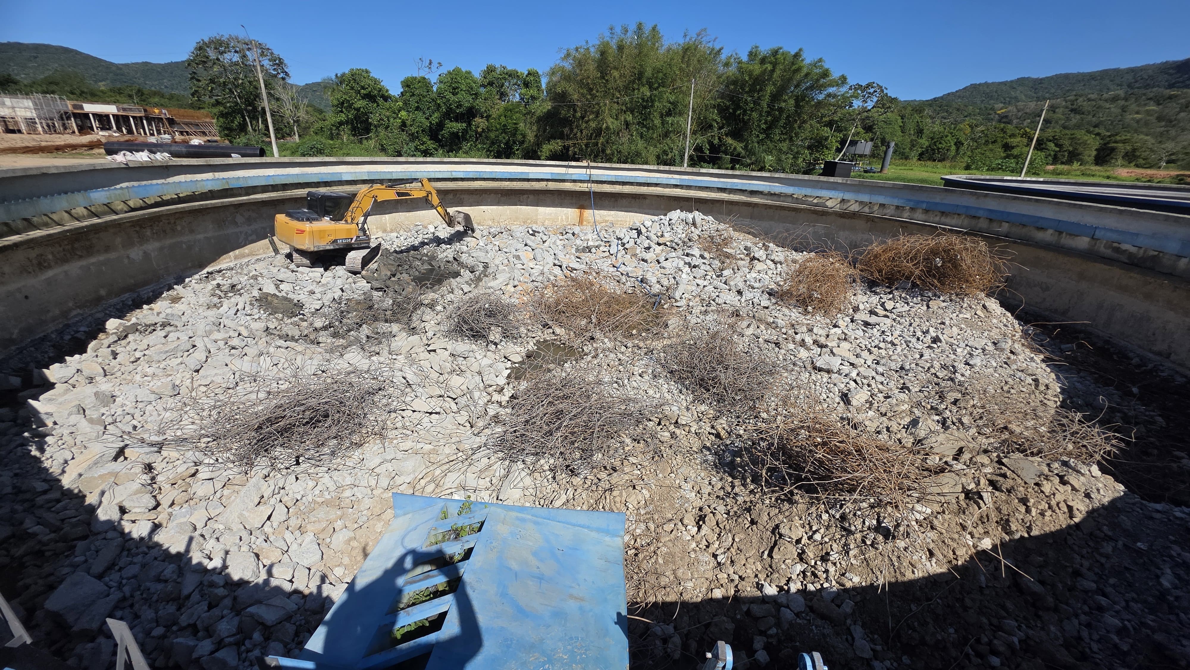 As obras de reforma do Decantador 3 da Estação de Tratamento de Esgoto (ETE) da Empresa Municipal de Água e Saneamento (Emasa), no Bairro Nova Esperança, avançam para o desmonte do piso e da base que sustenta toda a estrutura do decantador. Toneladas de concreto e ferro estão sendo retiradas para dar lugar a uma nova fundação, mais moderna e segura. Com investimento aproximado de R$ 1,4 milhão, os trabalhos começaram há cerca de um mês e integram o plano de modernização e manutenção da ETE.