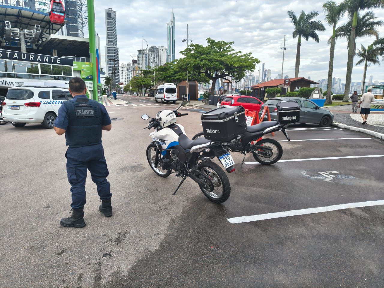 Os agentes estão posicionados na Avenida Atlântica, na Barra Sul, com toda a sinalização necessária para garantir segurança e fluidez ao trânsito. No local, foi mantido um espaço reservado para viaturas em serviço, destinado a eventuais situações de emergência.