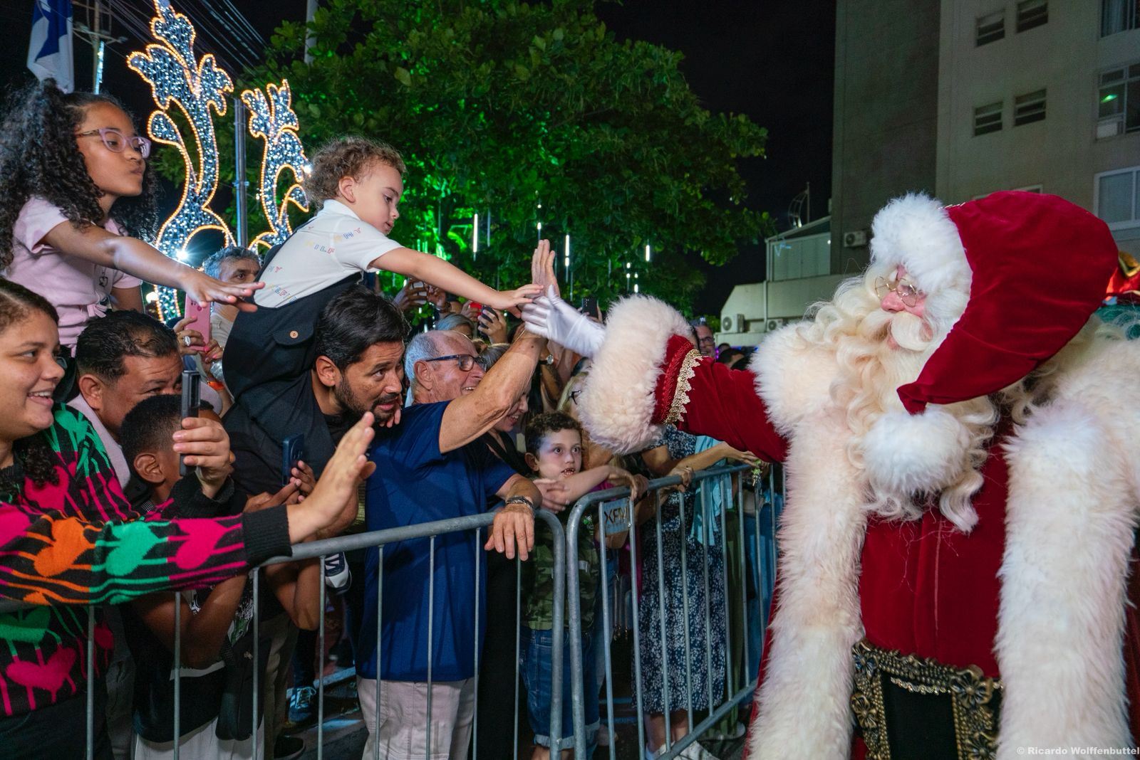 O público também acompanhou de perto a chegada do Papai Noel, que recebeu simbolicamente a chave da cidade das mãos da prefeita. Antes do acendimento das luzes natalinas de forma simultânea na Avenida Atlântica e Praça Almirante Tamandaré, um pocket show fez uma prévia do que a população pode esperar das apresentações que serão feitas durante os desfiles natalinos a partir de quarta-feira (19).