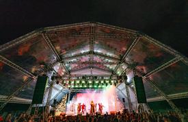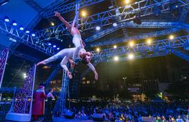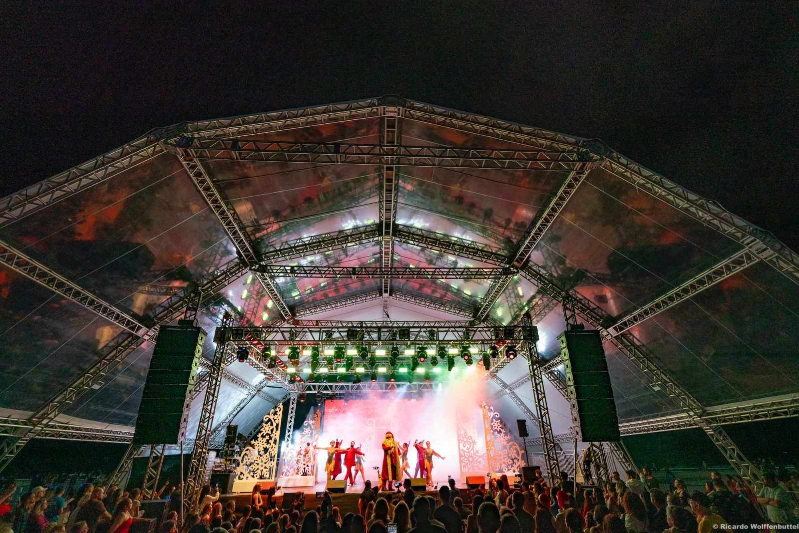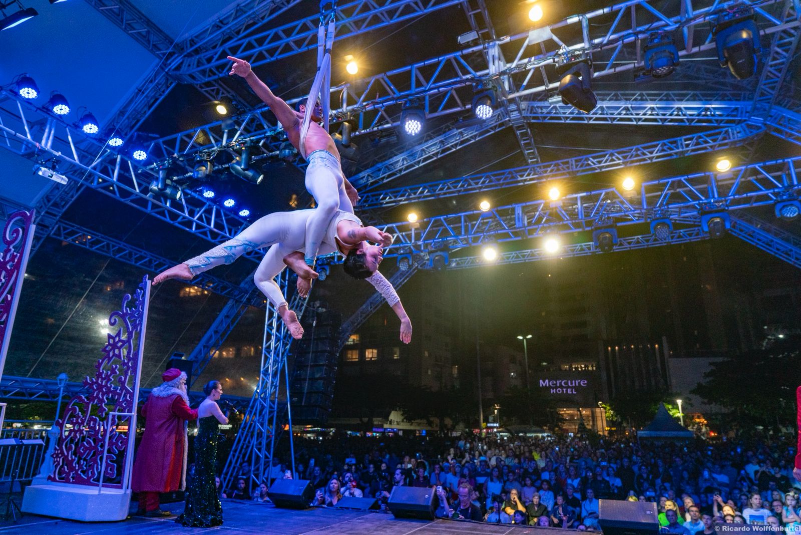 A apresentação “Simplesmente Natal” celebrou a magia e o espírito natalino com música ao vivo, dança, teatro e acrobacias. No total 15 artistas, entre músicos e bailarinos, envolveram os presentes, que também puderam apreciar três dos carros alegóricos - estacionados ao lado da Praça Almirante Tamandaré. Eles serão utilizados nos desfiles que percorrerão toda a orla da Praia Central.