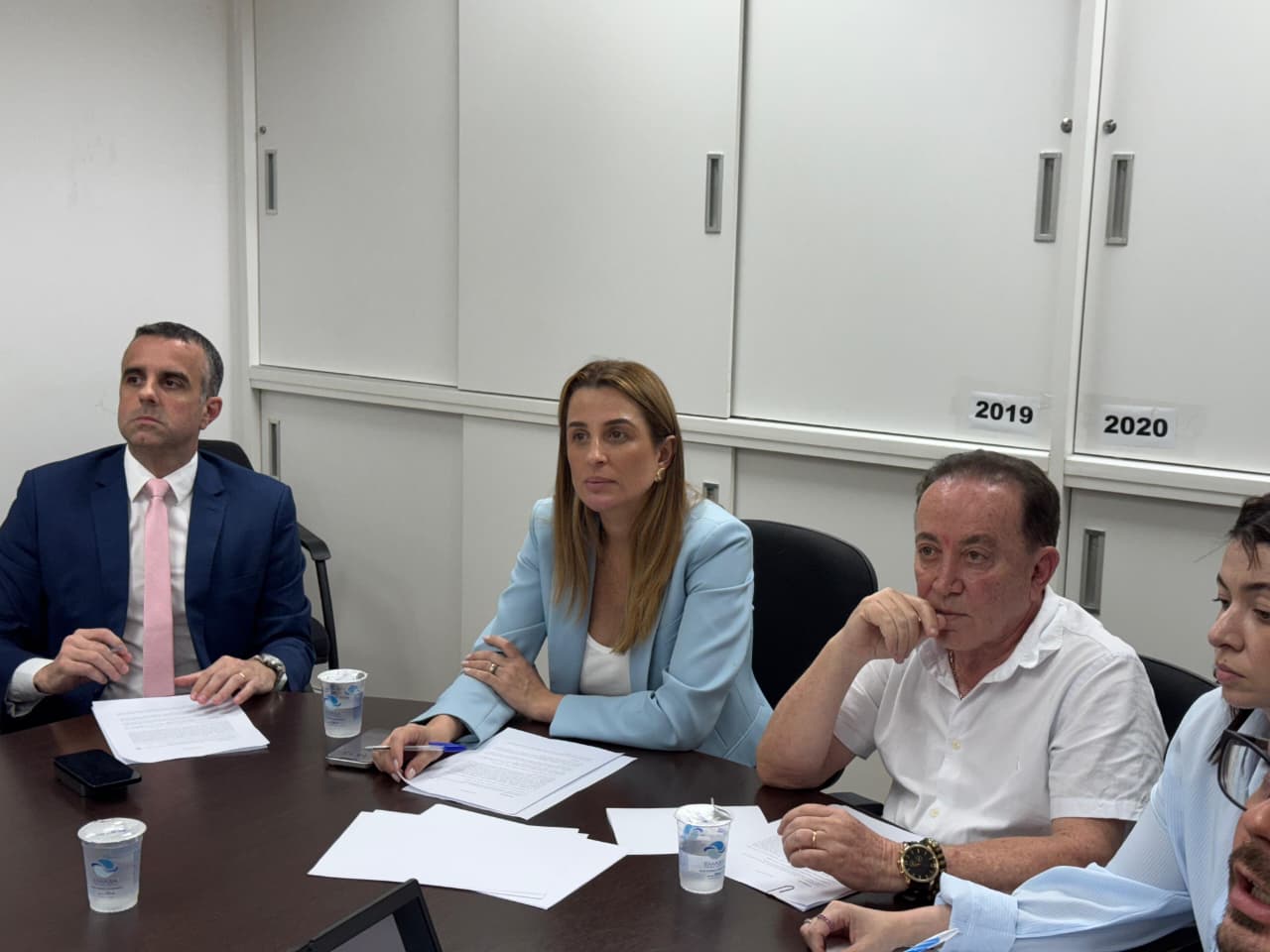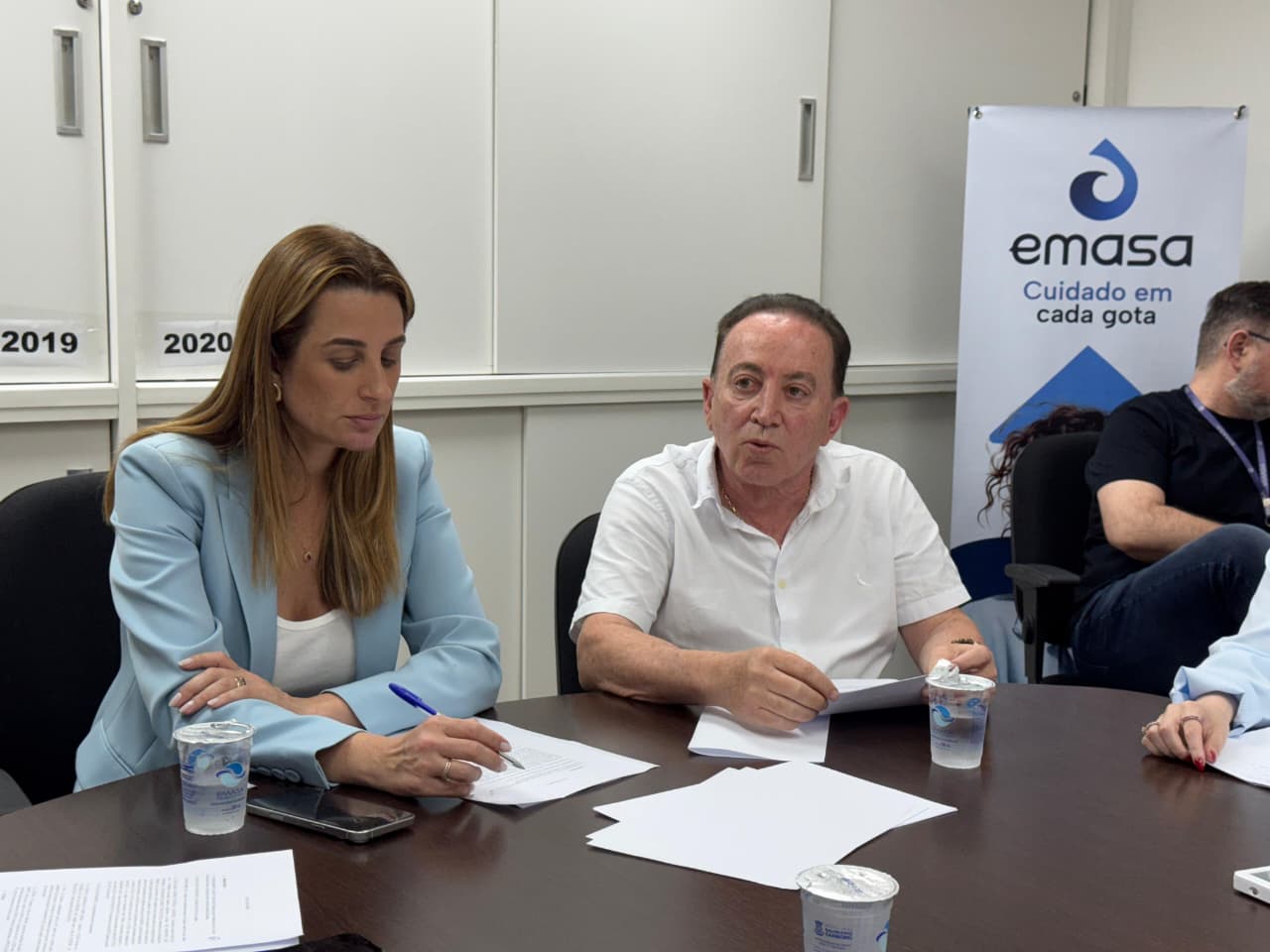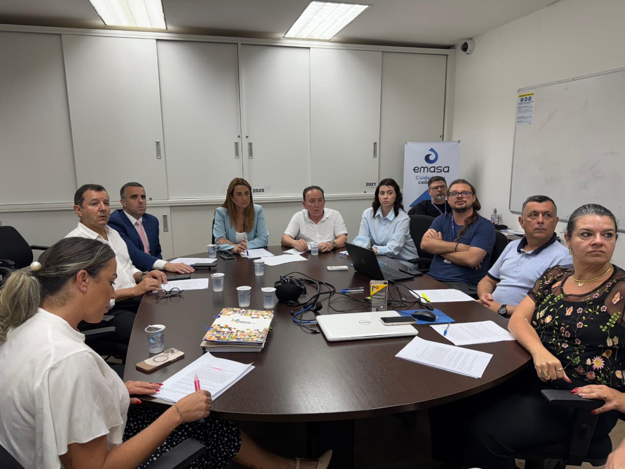 Além da diretoria e equipe técnica da Emasa, participaram também da reunião o procurador do município, Diego Montibeler, a secretária de Saúde, Aline Leal, e a secretária interina de Governo, Inovação e Orçamento, Kattiúcia Villain.