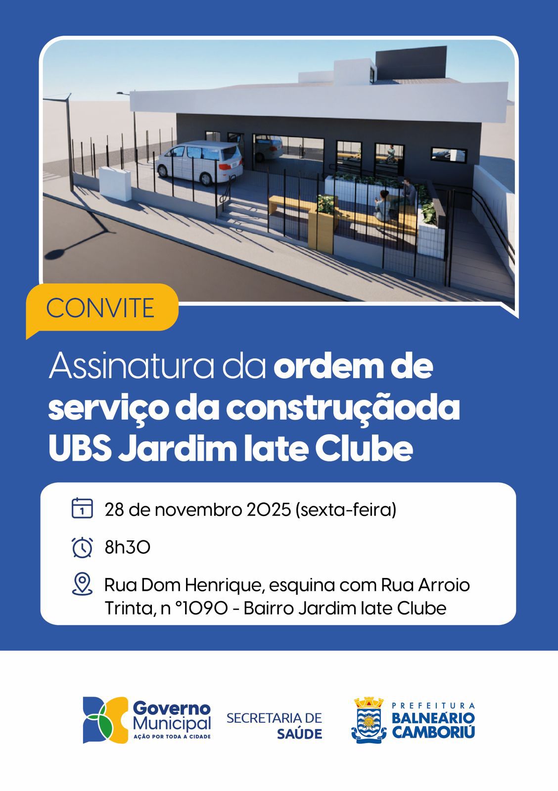 A ordem de serviço para a construção da Unidade Básica de Saúde (UBS) do Bairro Jardim Iate Clube será assinada a partir das 8h30 desta sexta-feira (28), na Rua Dom Henrique, esquina com Rua Arroio Trinta, no terreno onde o imóvel será construído.