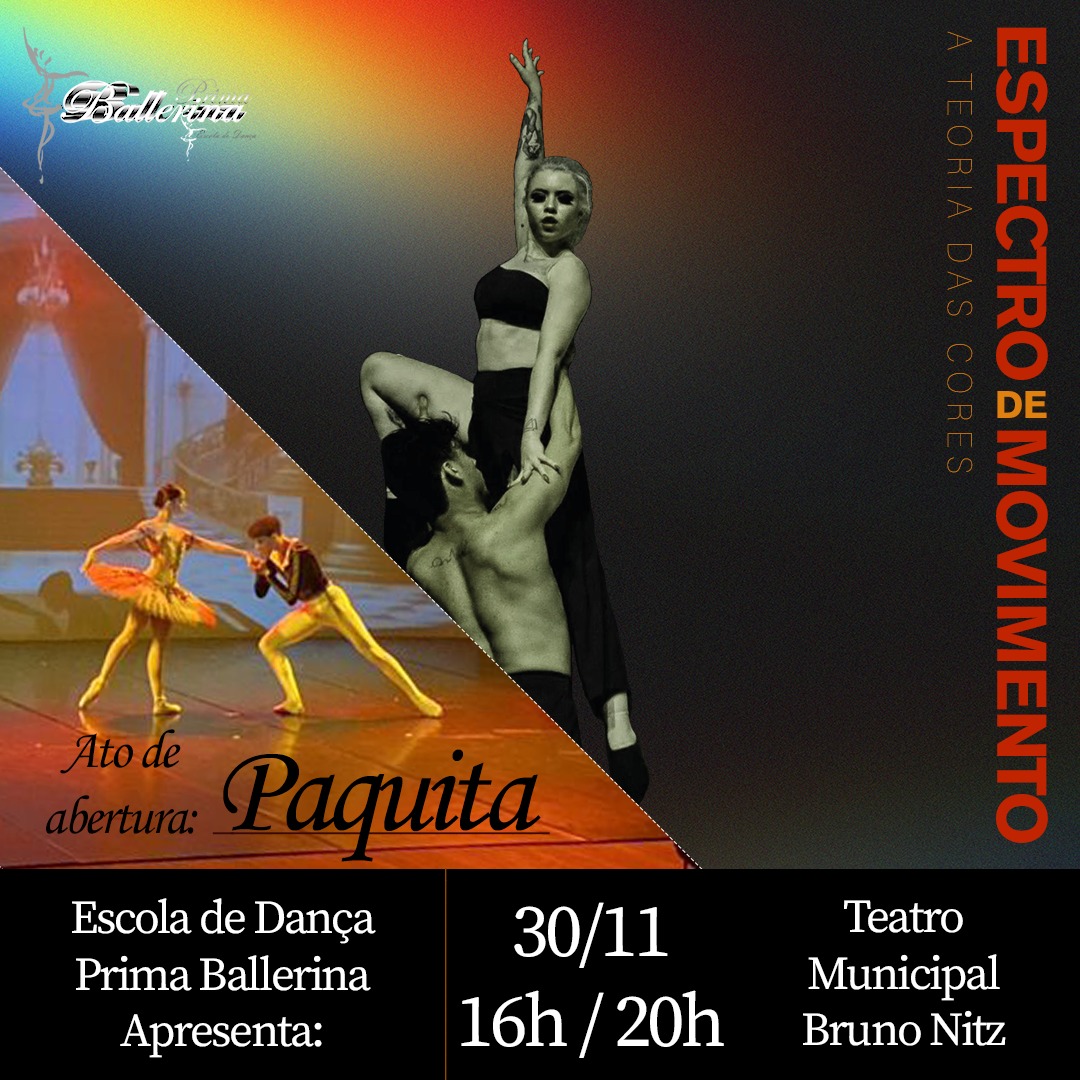 O Teatro Municipal Bruno Nitz, em Balneário Camboriú, recebe o espetáculo de dança “Espectro de Movimento” neste domingo (30), às 16h e às 20h. Em ambas as sessões, a abertura será com o ballet de repertório “Paquita”. Os ingressos estão à venda pelo site www.ticketideal.com.br.