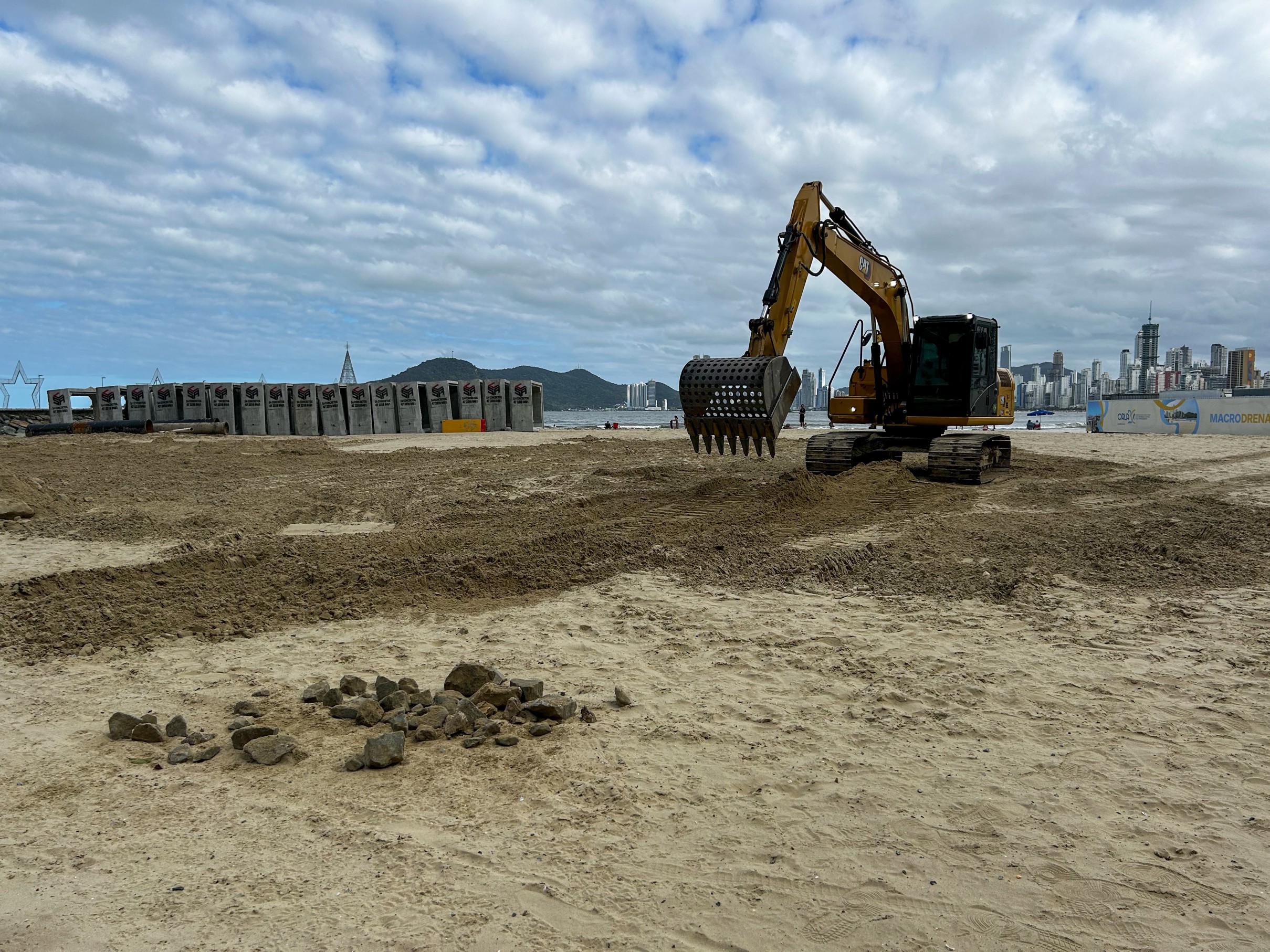 O peneiramento da areia da Praia Central, no trecho impactado pelas obras de macrodrenagem, segue em andamento em Balneário Camboriú. A ação, iniciada na segunda-feira (24) com a etapa manual, avançou para uma nova fase na tarde de quinta-feira (27), quando a máquina equipada com concha peneirada passou a atuar no local.