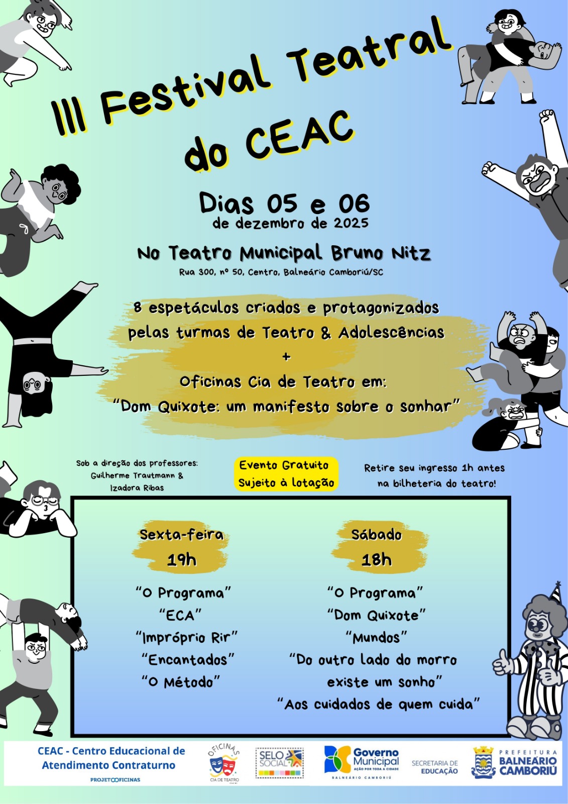 Fechando a primeira semana do mês, o “3º Festival Teatral do CEAC” levará ao palco oito espetáculos criados e protagonizados pelas turmas de Teatro e Adolescências sexta-feira (5), às 19h, e sábado (6), às 18h. A entrada também é gratuita.