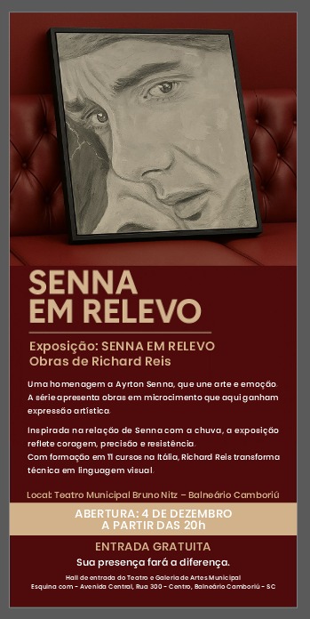Também na quinta-feira, mas às 20h e no hall do Teatro, será aberta a exposição “Senna em Relevo”, do artista Richard Reis. Com dez obras em microcimento, a exposição homenageia Ayrton Senna e poderá ser visitada gratuitamente até o fim de dezembro. As pinturas foram inspiradas na relação de Senna com a chuva e refletem coragem, precisão e resistência.