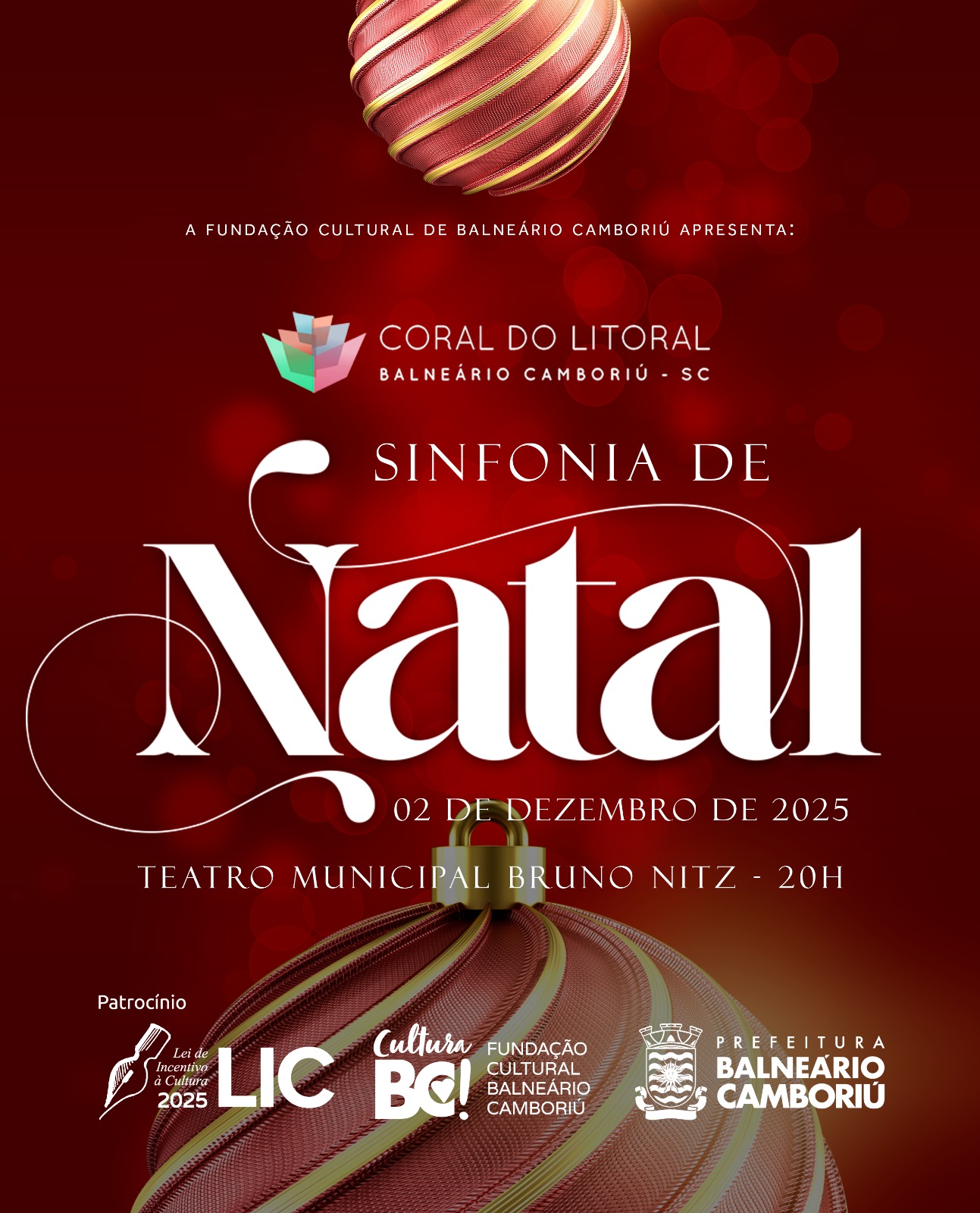 A agenda do mês será aberta ao som de clássicos natalinos na terça-feira (2), às 20h, com a “Sinfonia de Natal”. Patrocinado pela Lei de Incentivo à Cultura de Balneário Camboriú, o espetáculo terá entrada gratuita e reunirá o grande coro do Coral do Litoral, formado por vozes de diferentes faixas etárias e níveis de experiência. A sinfonia contará com a participação de uma orquestra especialmente formada para o evento e solistas convidados. Os ingressos gratuitos devem ser reservados na plataforma Sympla (https://www.sympla.com.br/evento/sinfonia-de-natal/3096235).