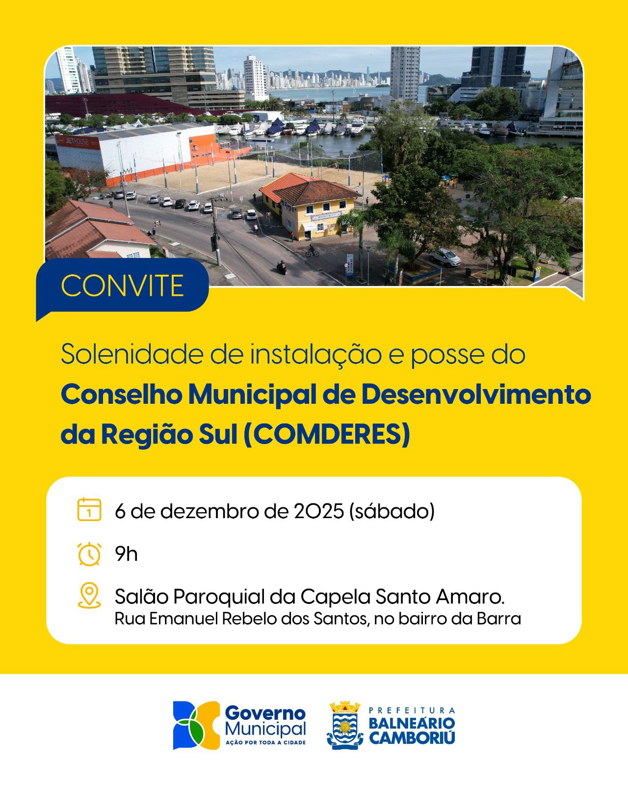 A Prefeitura de Balneário Camboriú vai oficializar, neste sábado (6), a instalação e a posse do Conselho Municipal de Desenvolvimento da Região Sul – criado pela Lei Complementar nº 115/2025. A solenidade acontece às 9h no Salão Paroquial da Capela Santo Amaro – localizado na Rua Emanuel Rebelo dos Santos, no bairro da Barra – com a presença de gestores públicos, lideranças políticas, representantes de entidades participantes e líderes comunitários.