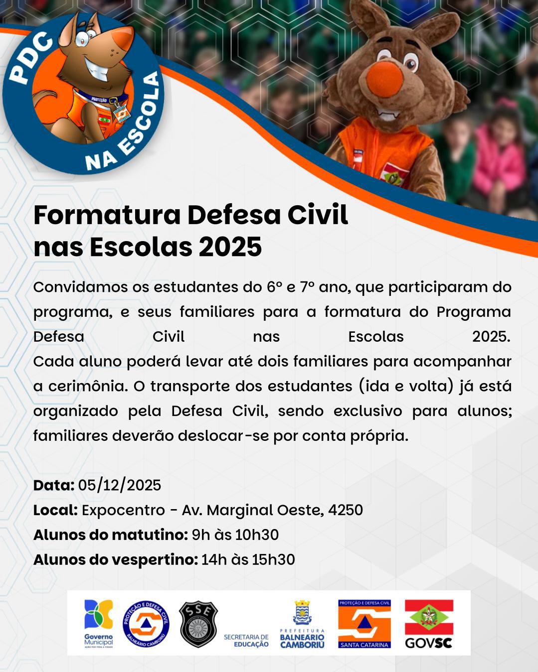 Os estudantes do 6° e 7° anos da rede municipal de ensino de Balneário Camboriú participaram, nesta sexta-feira (5), da formatura do programa Defesa Civil nas Escolas. A ação é uma iniciativa da Prefeitura, por meio da Secretaria de Segurança e Ordem Pública, através do Departamento de Proteção e Defesa Civil.