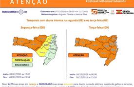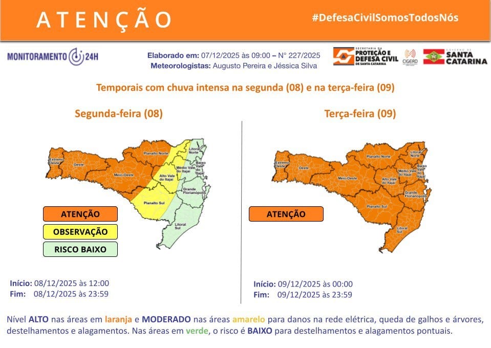Além disso, reforça que a população deve acompanhar os avisos meteorológicos e evitar áreas de risco durante as tempestades. Para emergências, o atendimento de plantão está disponível pelo telefone (47) 99232-4928 e pelo número 199.